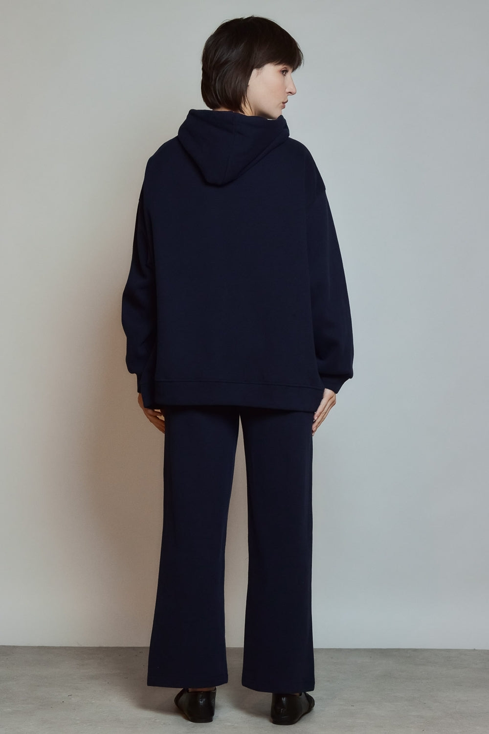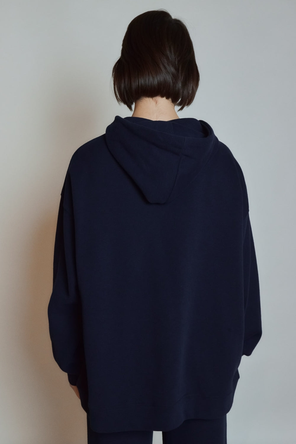Gilet à capuche avec fermeture éclair centrale et volume ample. Capuche structurée par des liens ajustables terminés par embouts métalliques. Manches longues à épaules tombantes et poches intégrées sur l’avant.