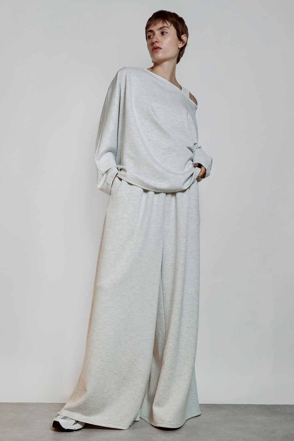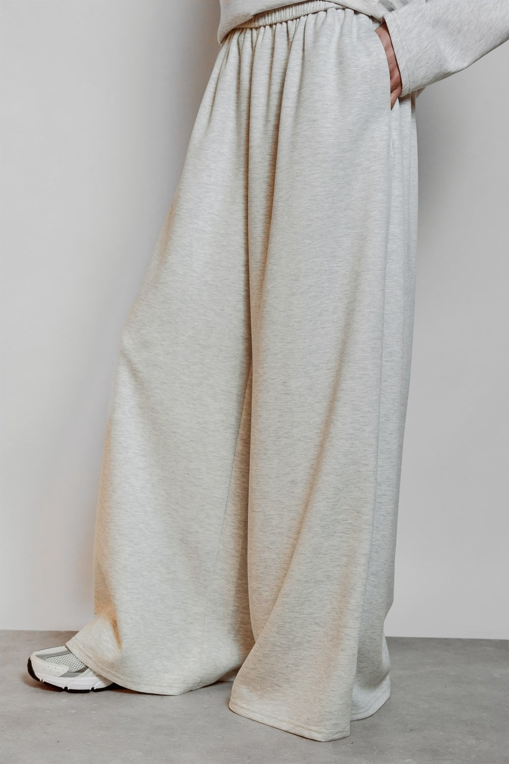Wide-leg trousers with a very flared leg. Elasticated waistband for easy on and off and optimal comfort. Lightweight fabric with a soft drape. Pocket-free design for a clean silhouette.