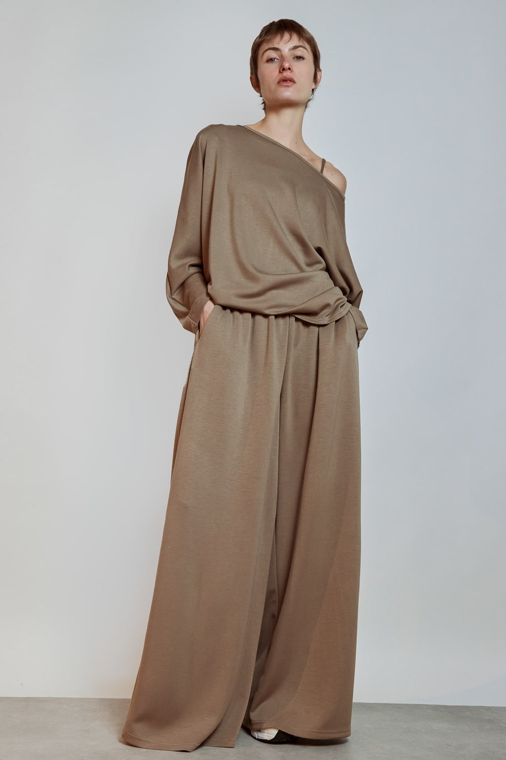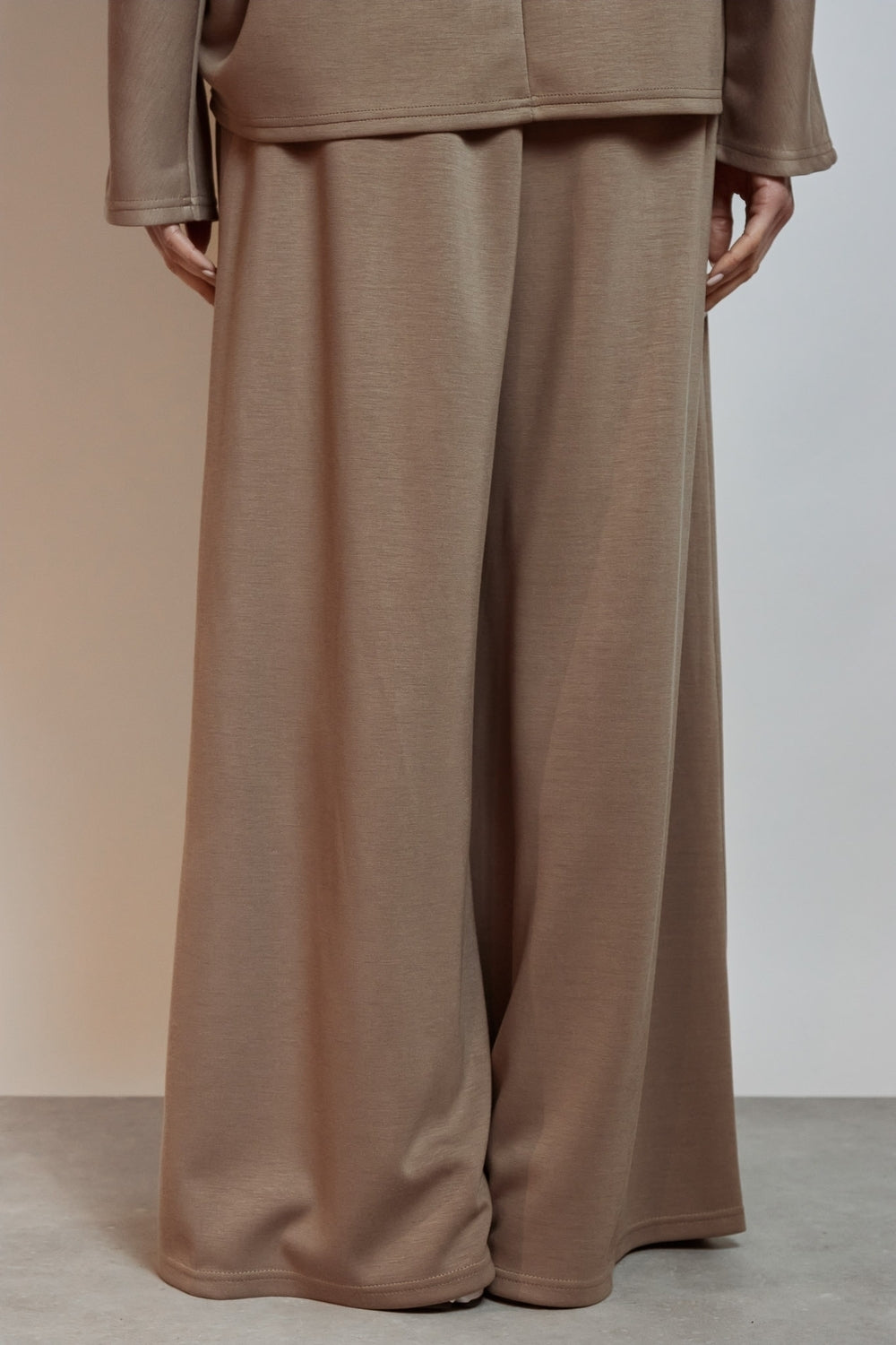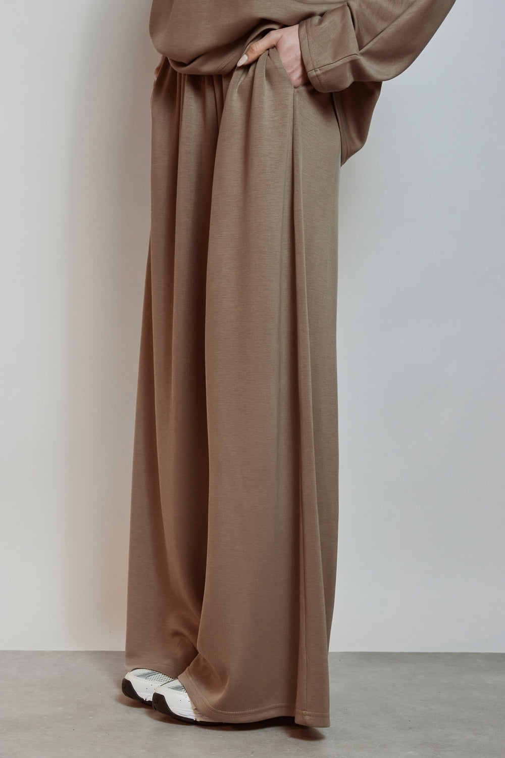 Wide-leg trousers with a very flared leg. Elasticated waistband for easy on and off and optimal comfort. Lightweight fabric with a soft drape. Pocket-free design for a clean silhouette.