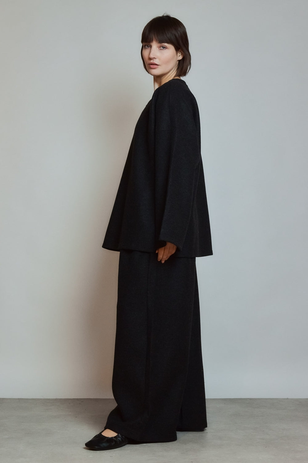Pantalon à taille élastiquée structurant le volume sans contrainte. Coupe ample à jambes longues et ligne droite créant un tombé fluide. Poches discrètes intégrées sur les côtés. Finition nette en bas de jambe pour une silhouette épurée et équilibrée.