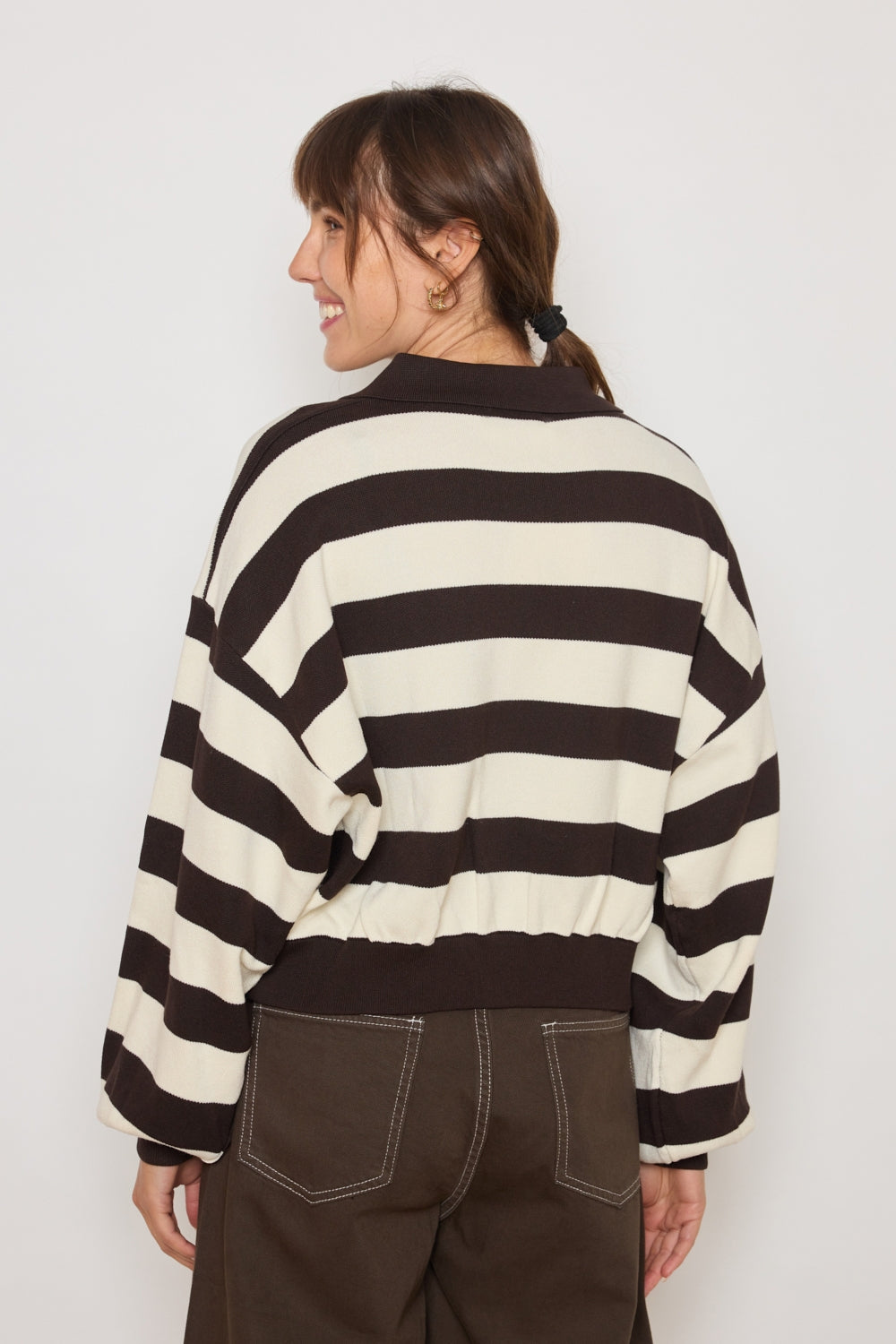 Pull à col polo avec ouverture zippée sur le devant. Coupe ample structurée par des épaules tombantes et des manches longues. Motif rayé horizontal apportant un rythme graphique régulier.