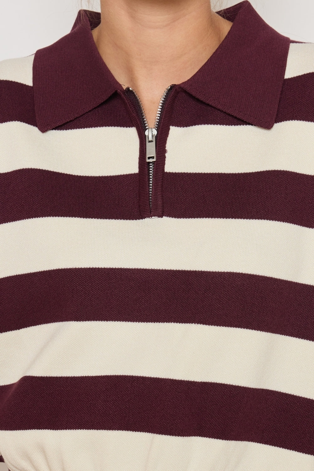 Pull à col polo avec ouverture zippée sur le devant. Coupe ample structurée par des épaules tombantes et des manches longues. Motif rayé horizontal apportant un rythme graphique régulier.