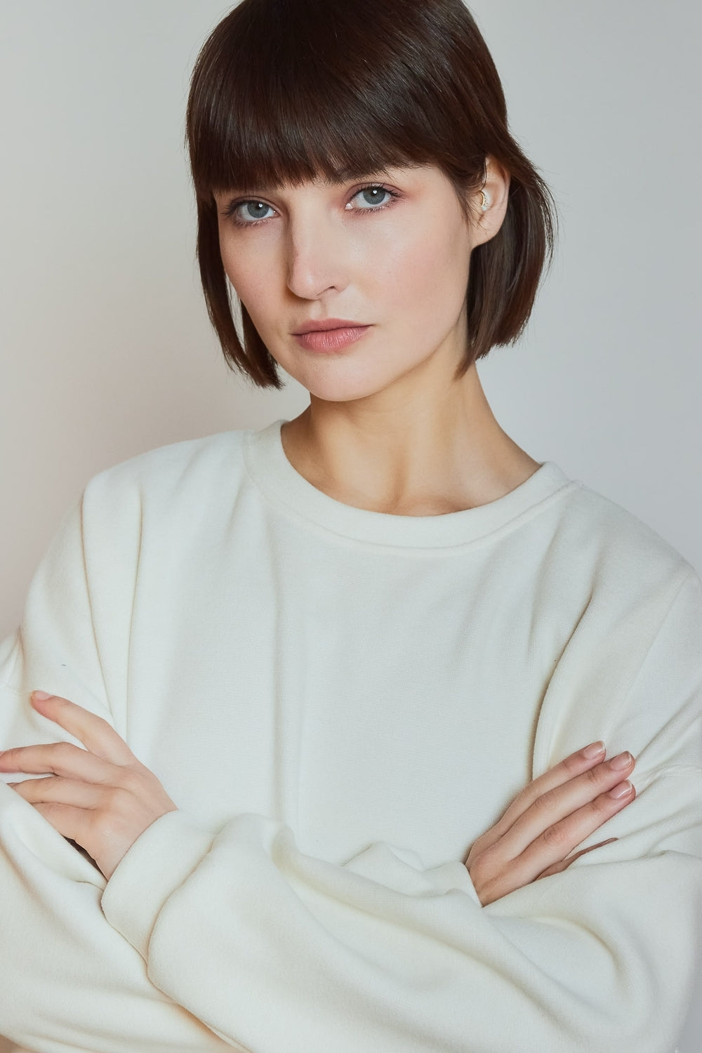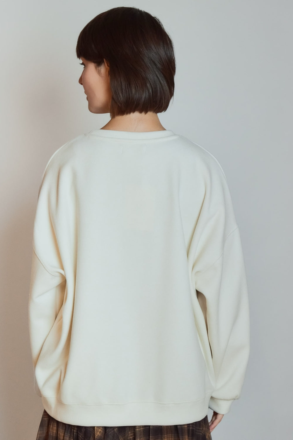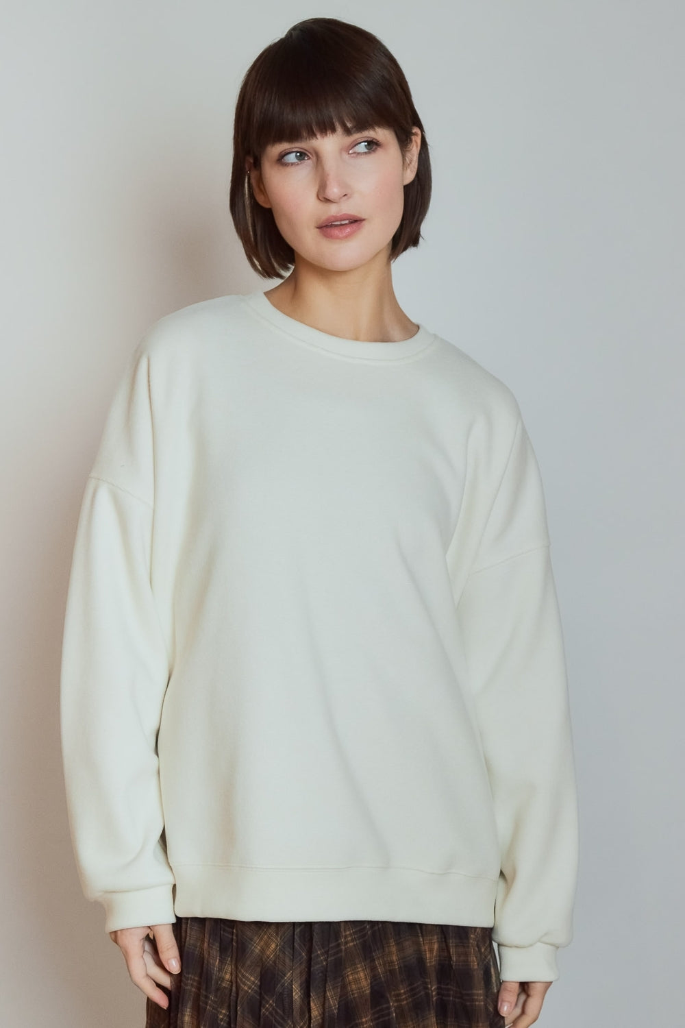 Sweatshirt à col rond et coupe ample offrant un porté décontracté. Volume généreux souligné par des épaules légèrement tombantes et des manches longues. Matière douce apportant confort et tenue au quotidien.