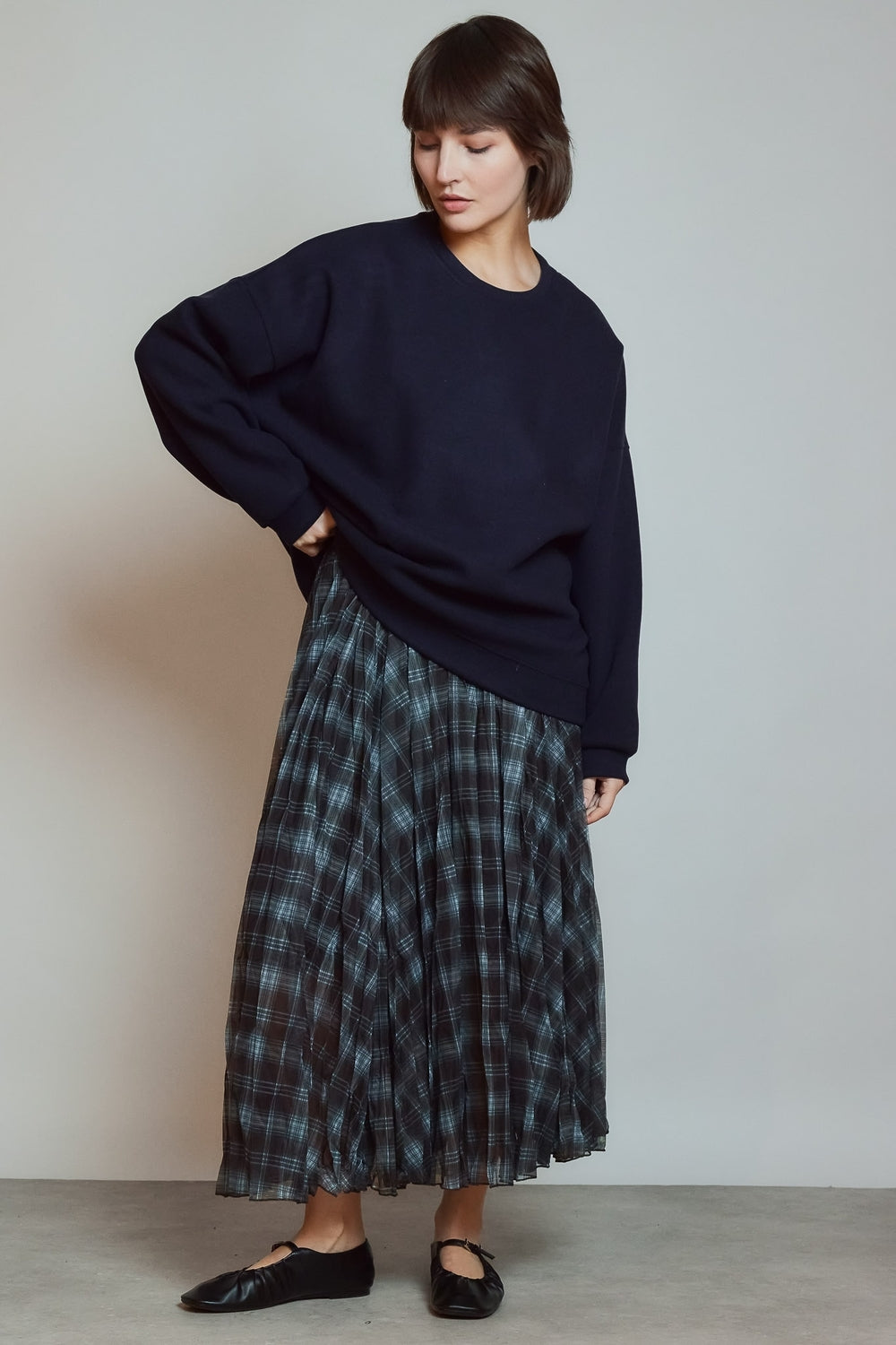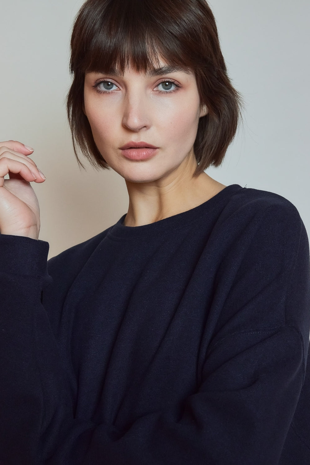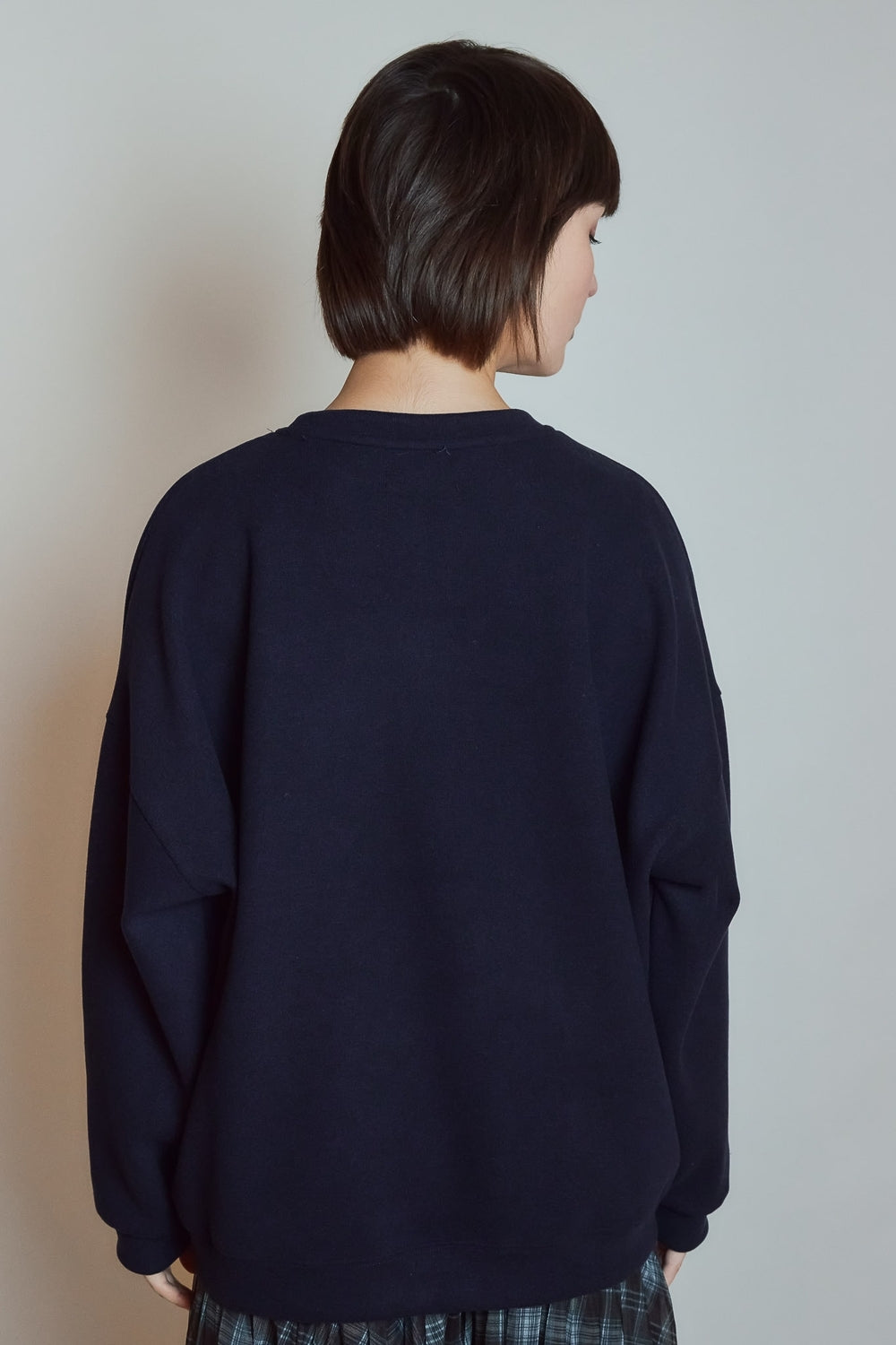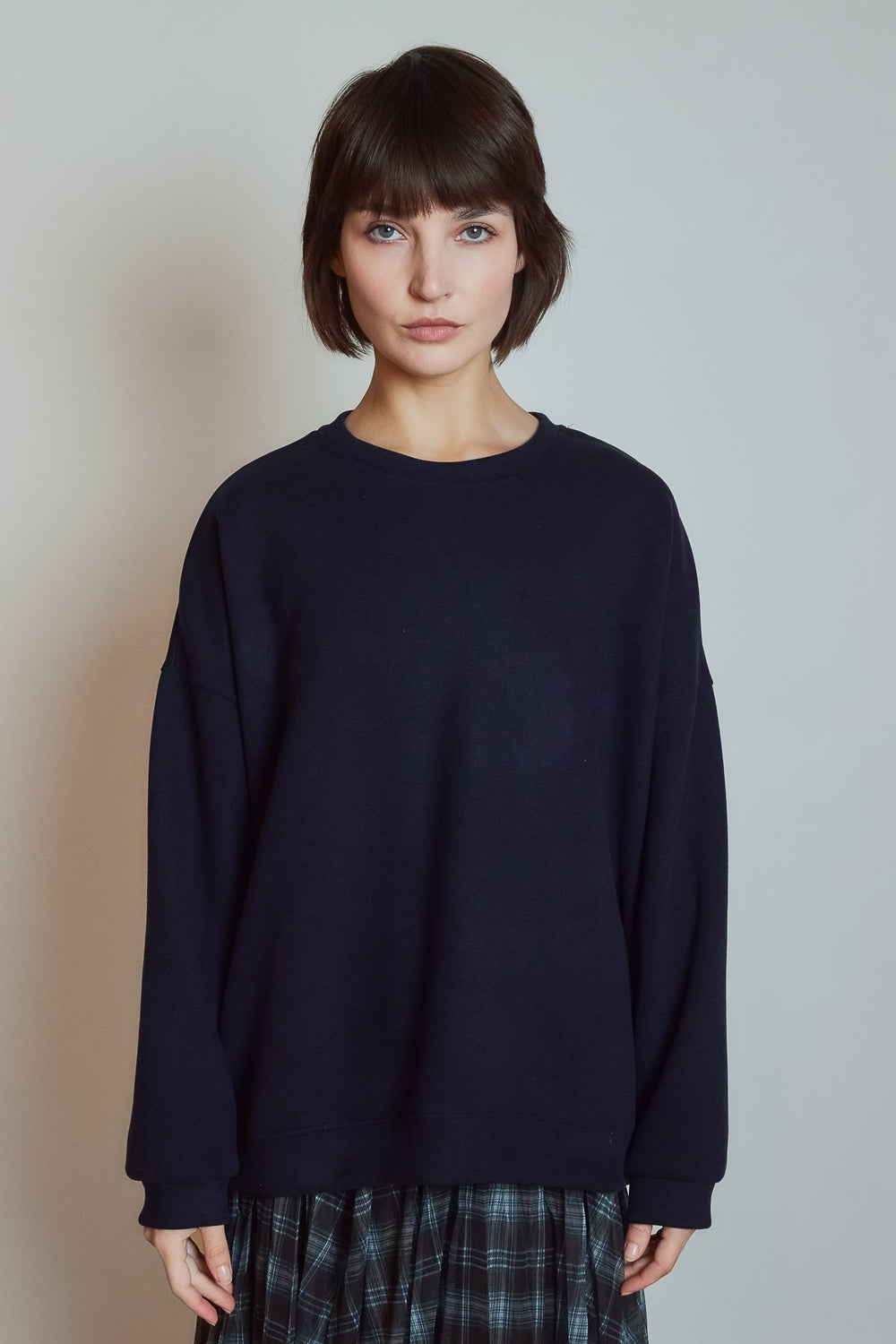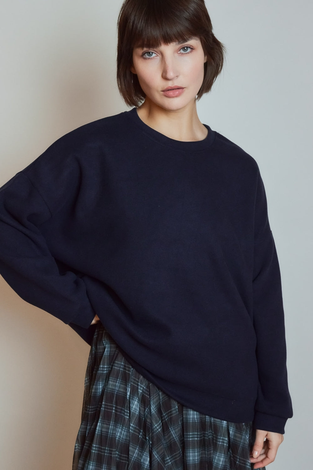 Sweatshirt à col rond et coupe ample offrant un porté décontracté. Volume généreux souligné par des épaules légèrement tombantes et des manches longues. Matière douce apportant confort et tenue au quotidien.