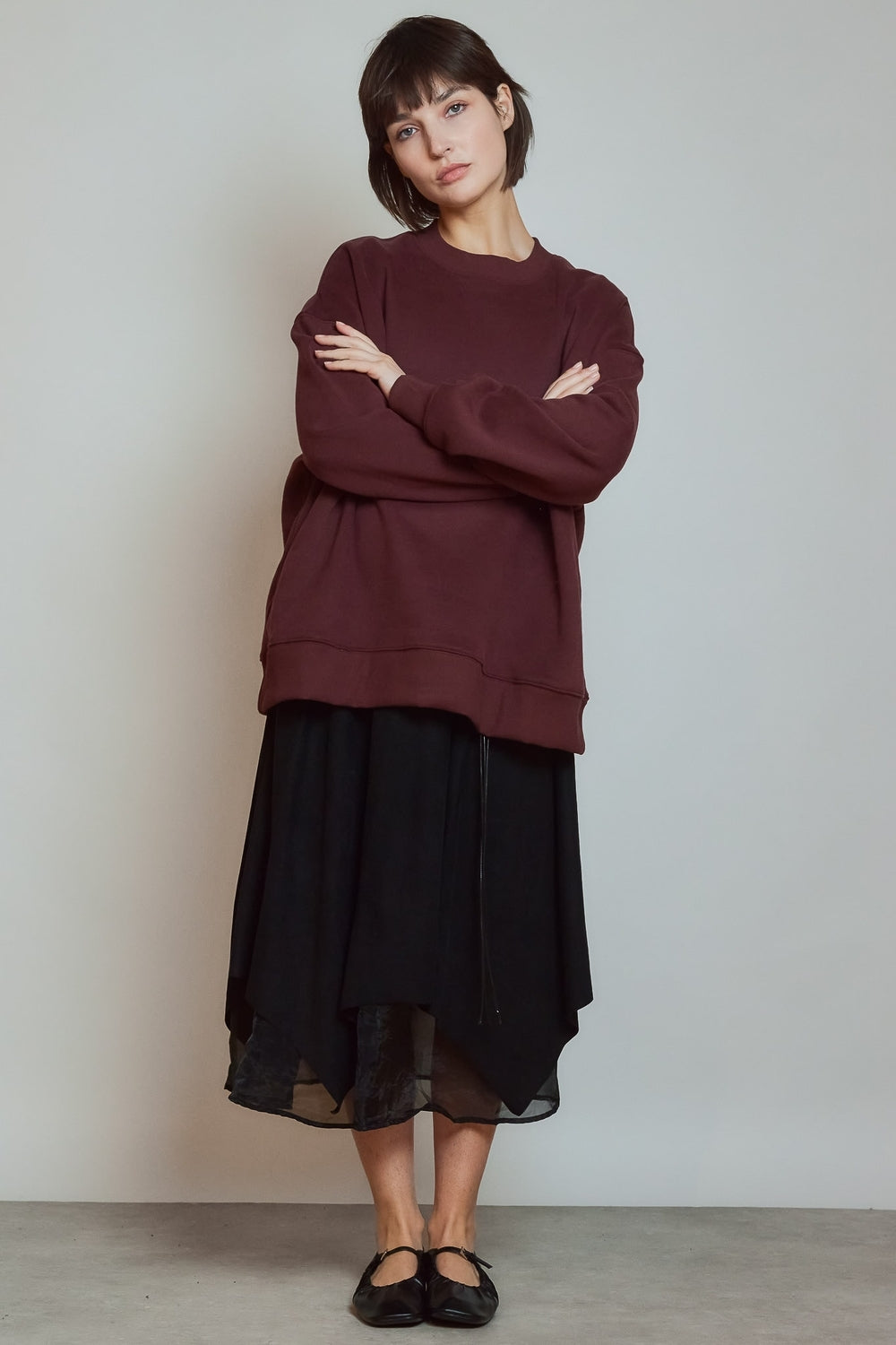 Sweat à encolure ronde avec coupe ample et volume souple. Épaules tombantes et manches longues structurées par des coutures apparentes. Base et poignets resserrés définissant la silhouette sans contrainte.