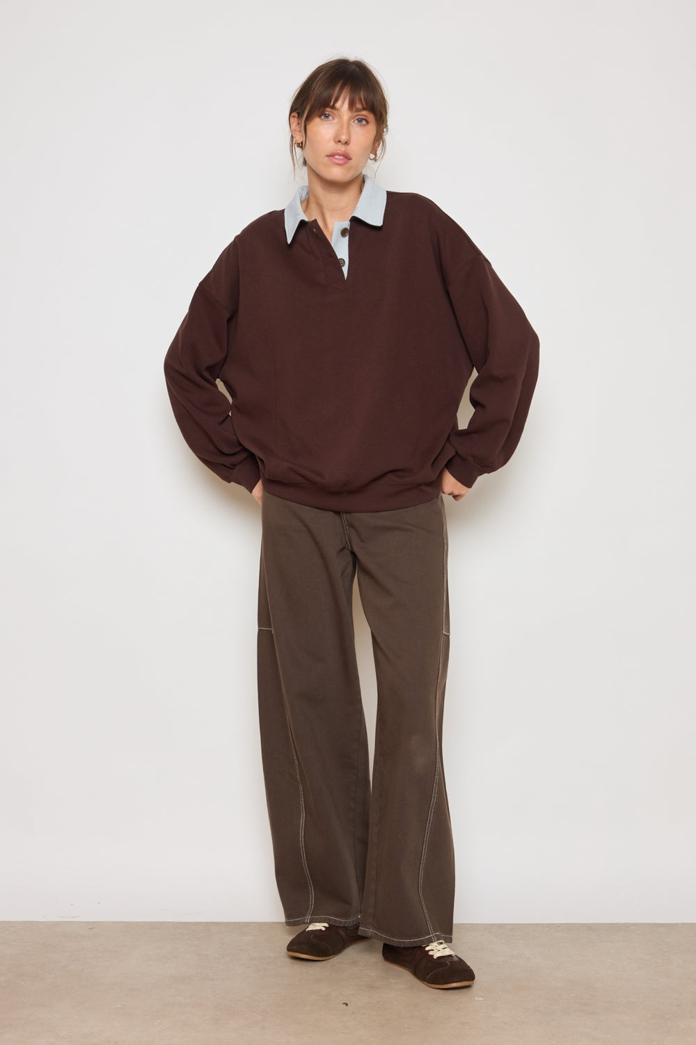 Sweat à col polo avec patte boutonnée courte sur le devant. Coupe ample structurée par des épaules tombantes et des manches longues. Col rapporté apportant une définition nette à l’encolure. Base et poignets resserrés dessinant une silhouette stable et équilibrée.