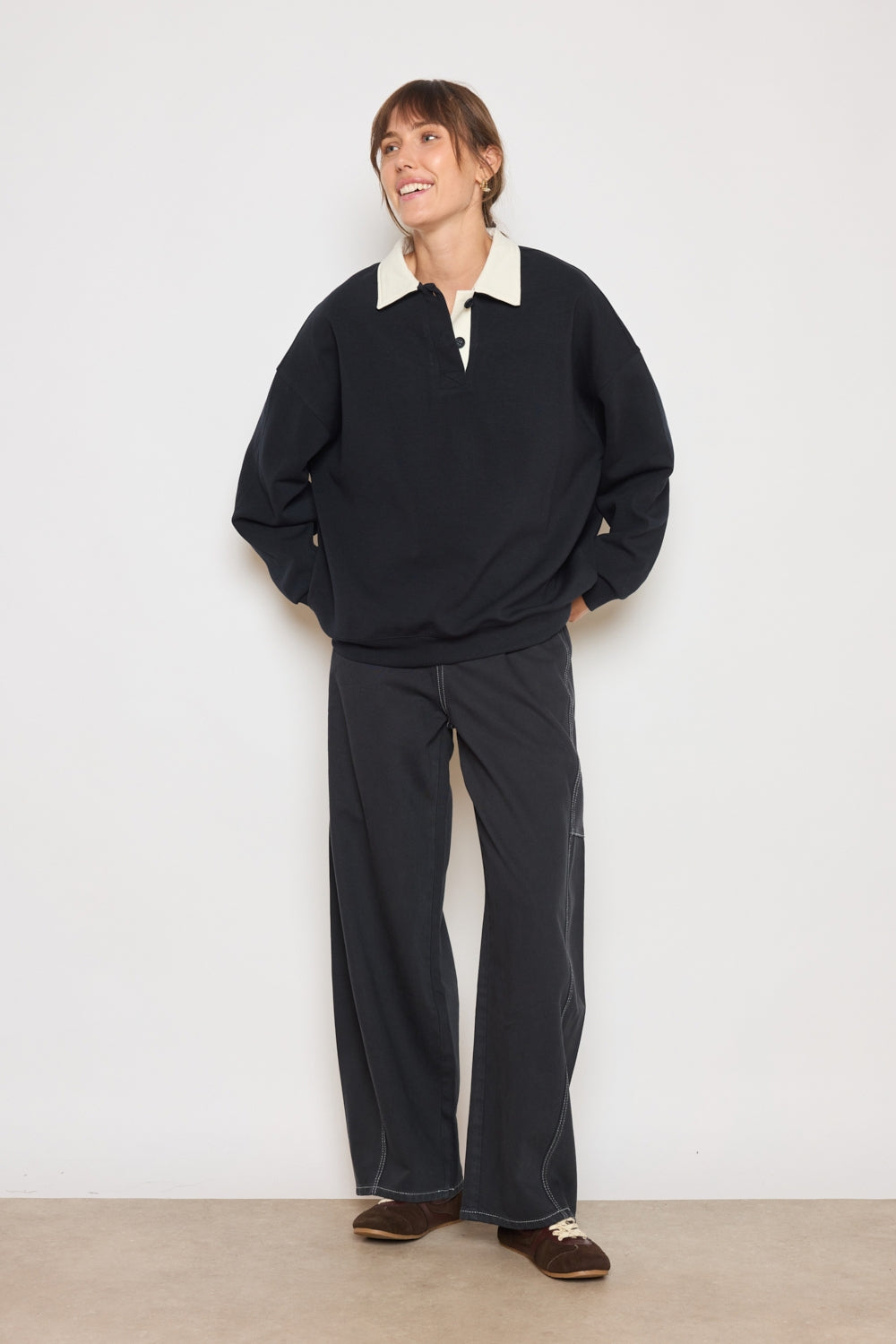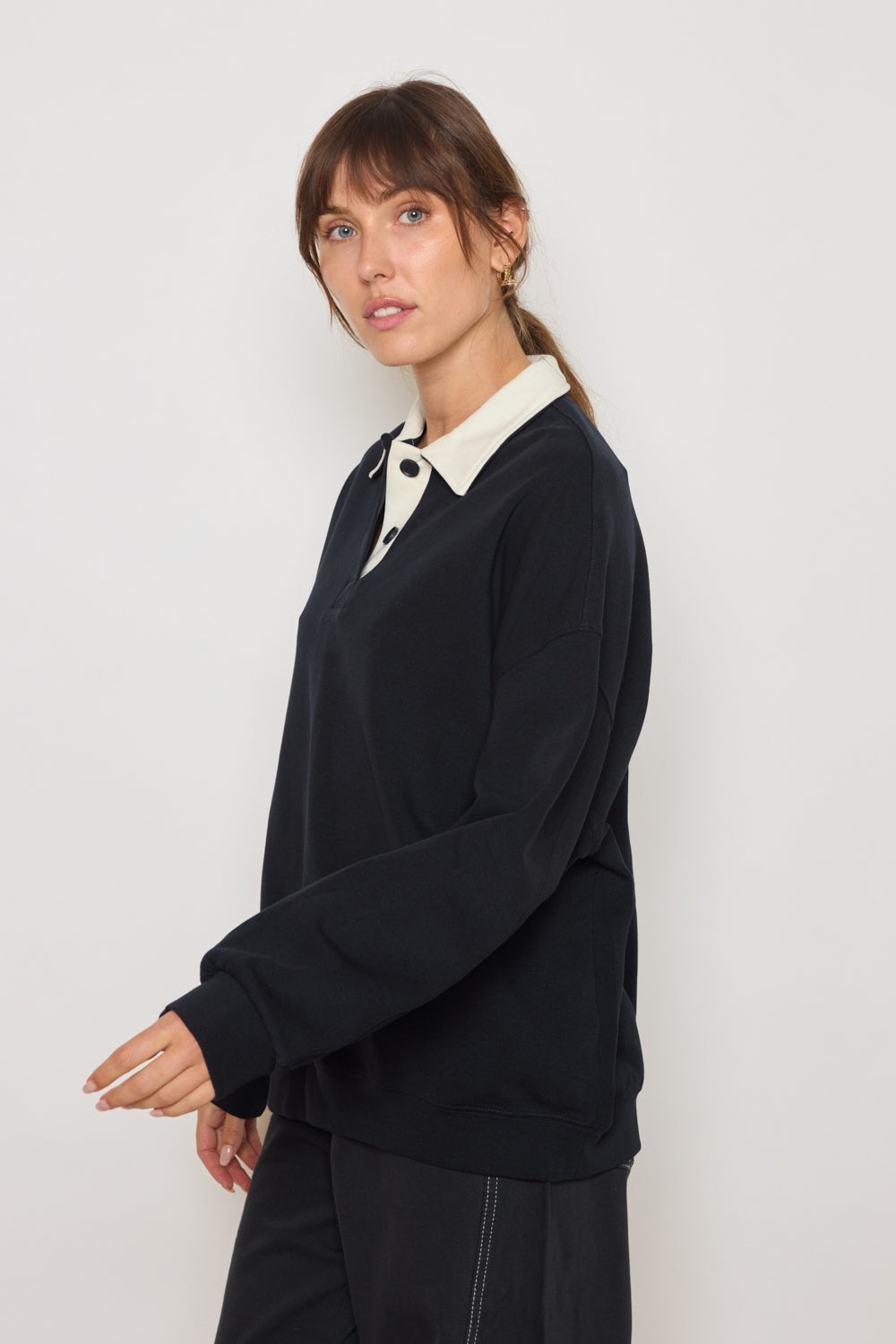 Sweat à col polo avec patte boutonnée courte sur le devant. Coupe ample structurée par des épaules tombantes et des manches longues. Col rapporté apportant une définition nette à l’encolure. Base et poignets resserrés dessinant une silhouette stable et équilibrée.