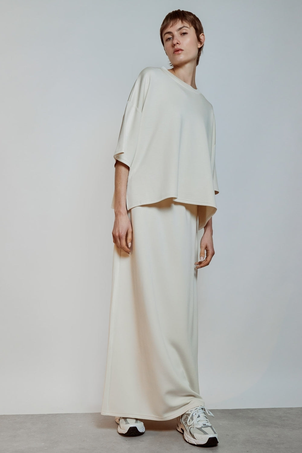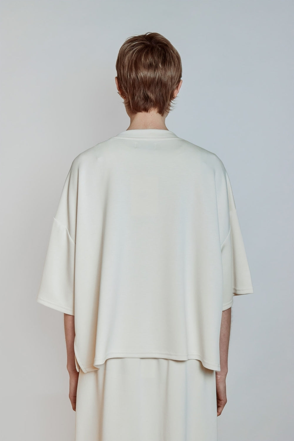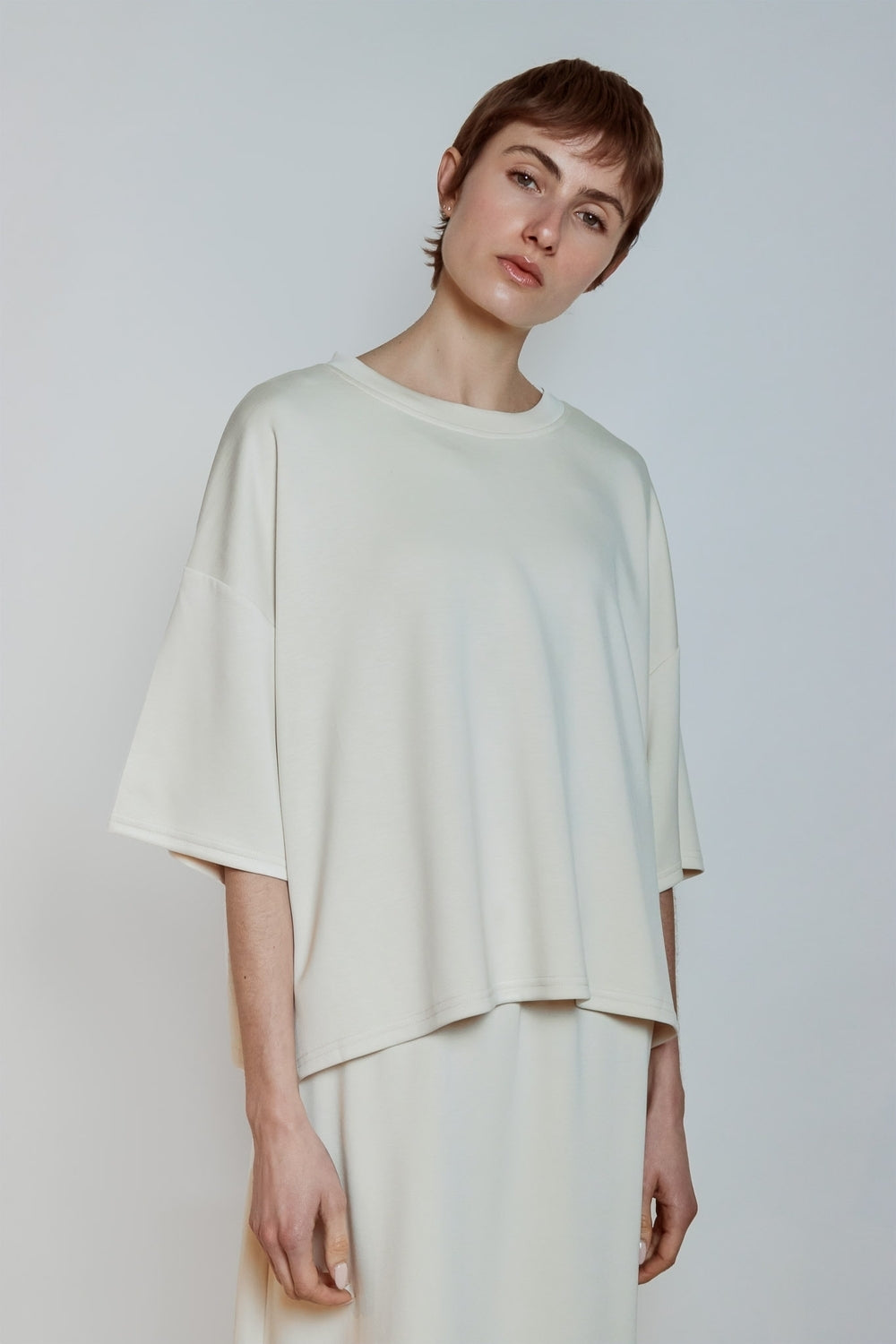 T-shirt à encolure ronde avec coupe ample et ligne droite. Manches courtes larges et épaules tombantes créant un volume fluide. Tombé souple structuré par une construction simple et continue.