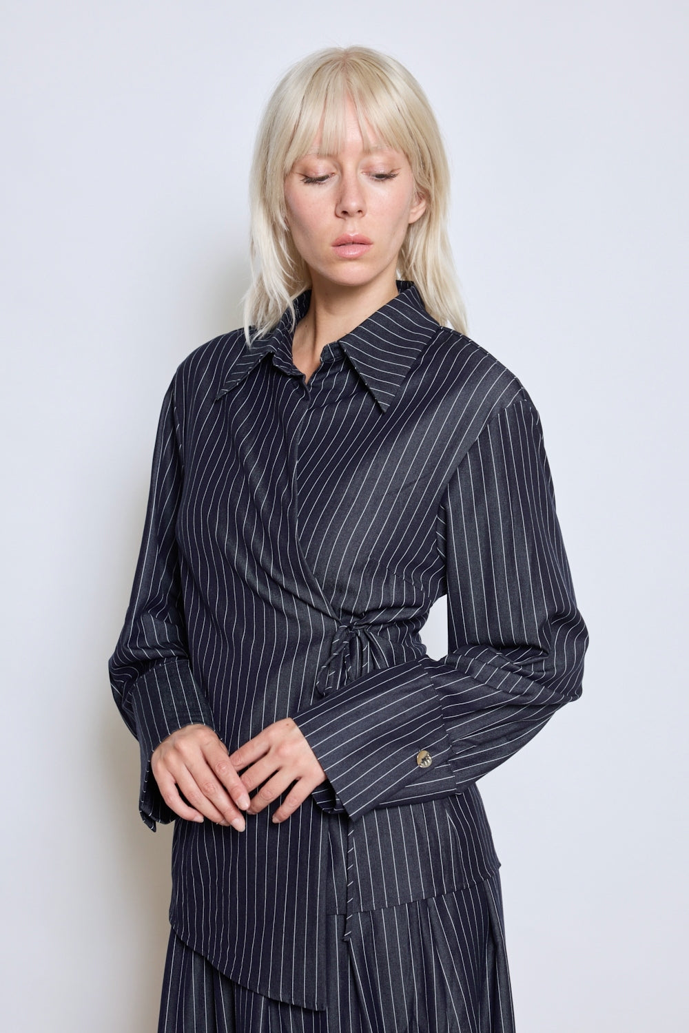 Chemise croisée à col classique et manches longues. Fermeture par lien sur le côté pour un ajustement sur mesure. Poignets longs avec boutonnières invisibles. Coupe asymétrique légèrement évasée.
