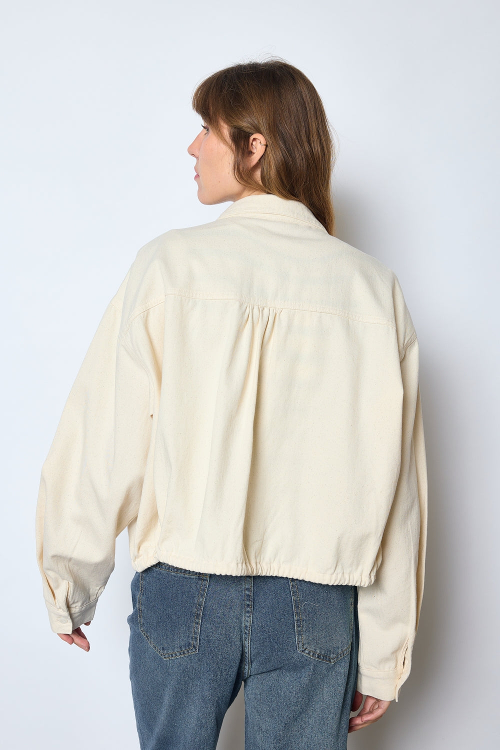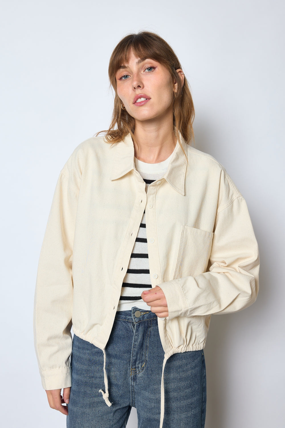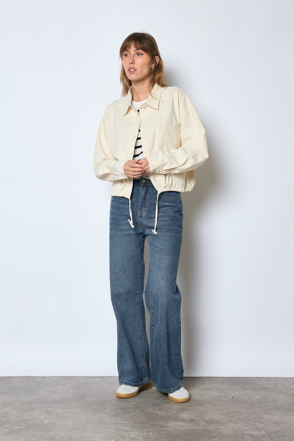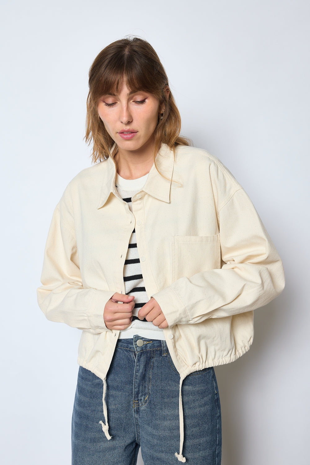 Chemise à col classique et fermeture boutonnée sur le devant. Manches longues à poignets boutonnés. Poche plaquée sur la poitrine. Base ajustable grâce à un cordon coulissant à nouer.