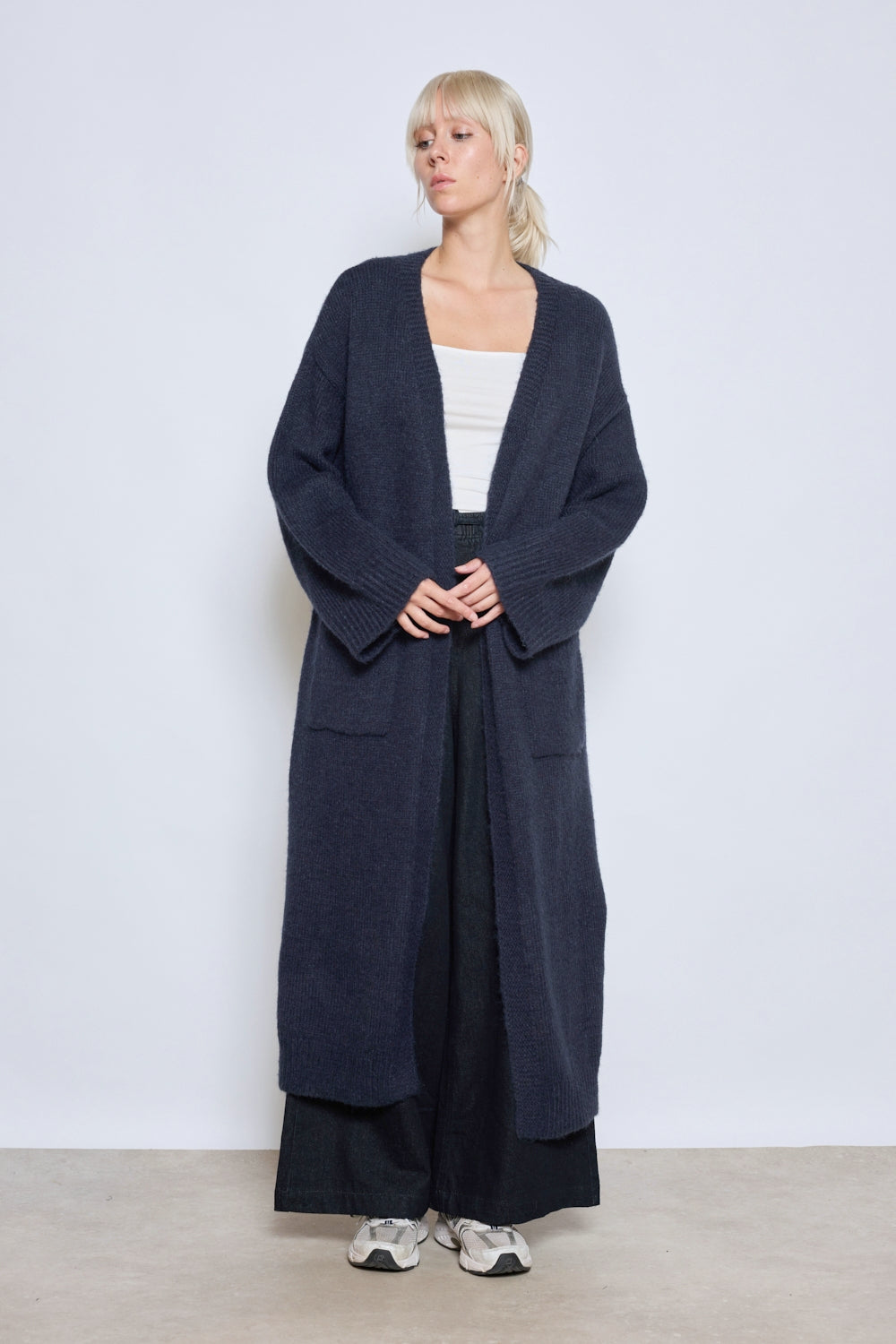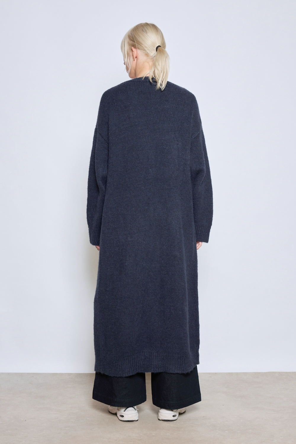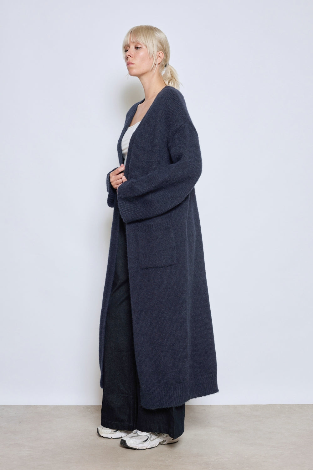 Cardigan à coupe droite avec col ouvert et longueur cheville. Manches longues légèrement tombantes. Deux poches plaquées à l’avant. Finitions côtelées sur les poignets et l’ouverture.