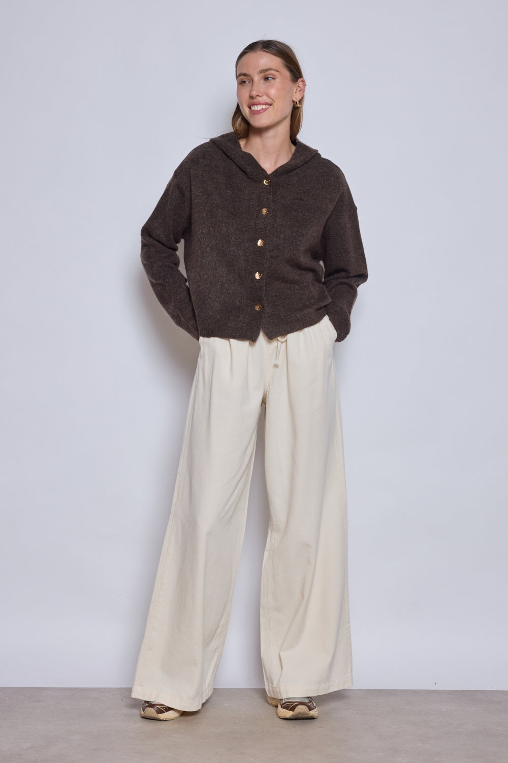 Cardigan court avec capuche intégrée et fermeture à boutons sur le devant. Manches longues légèrement amples et finitions côtelées aux poignets et à la taille pour un meilleur maintien. Coupe décontractée et confort optimale pour une silhouette moderne. Un style simple et pratique, parfait pour un look casual.