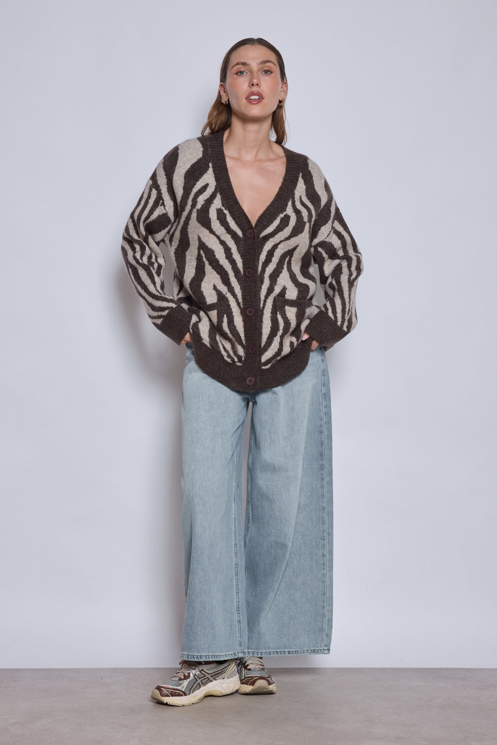 Cardigan à col en V profond avec fermeture boutonnée sur le devant. Manches longues et coupe ample pour un tombé décontracté. Motif contrasté sur l’ensemble de la pièce. Finitions côtelées au col, poignets et ourlet.