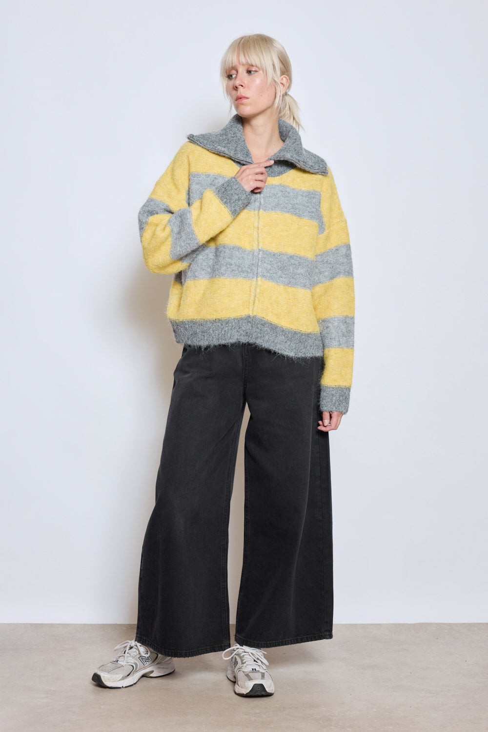 Pull à fermeture zippée avec col large structuré. Coupe droite avec manches longues et épaules tombantes. Motif à larges rayures horizontales. Finitions côtelées au col, poignets et ourlet.