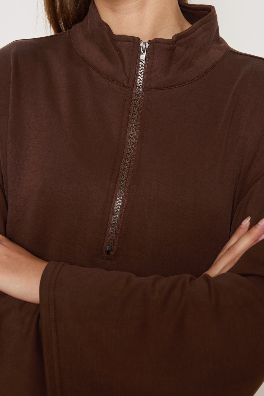 Sweat à manches longues avec fermeture zippée au col. Coupe droite et épaules tombantes pour une silhouette décontractée. Finitions droites au bas et poignets. Tissu fluide à toucher doux.