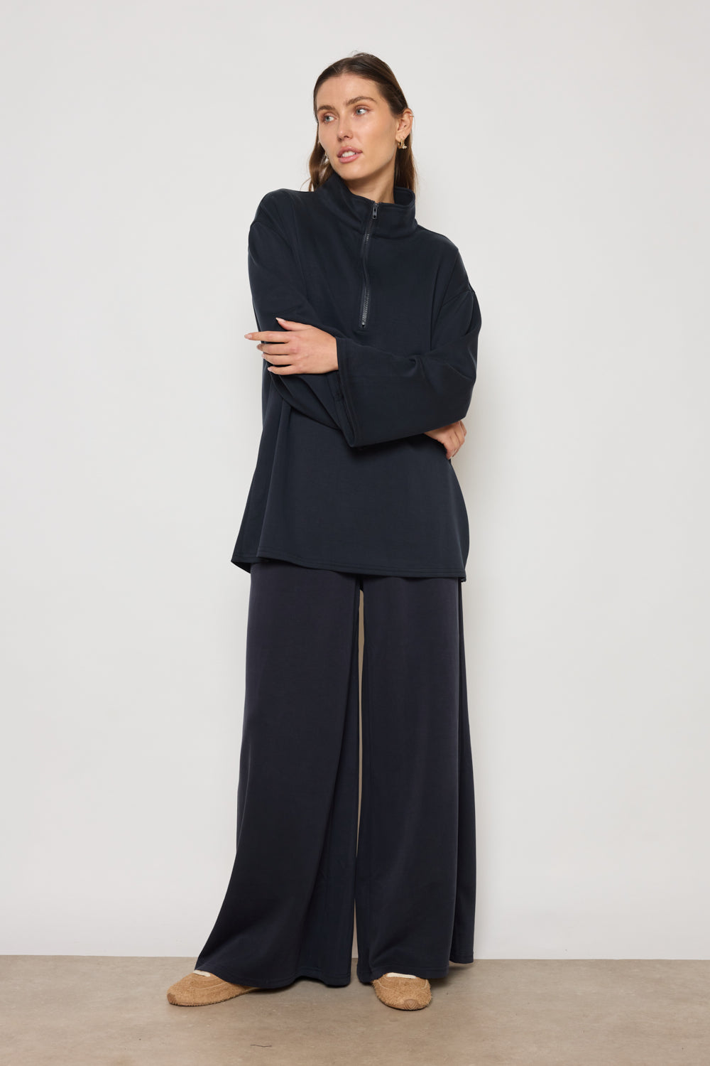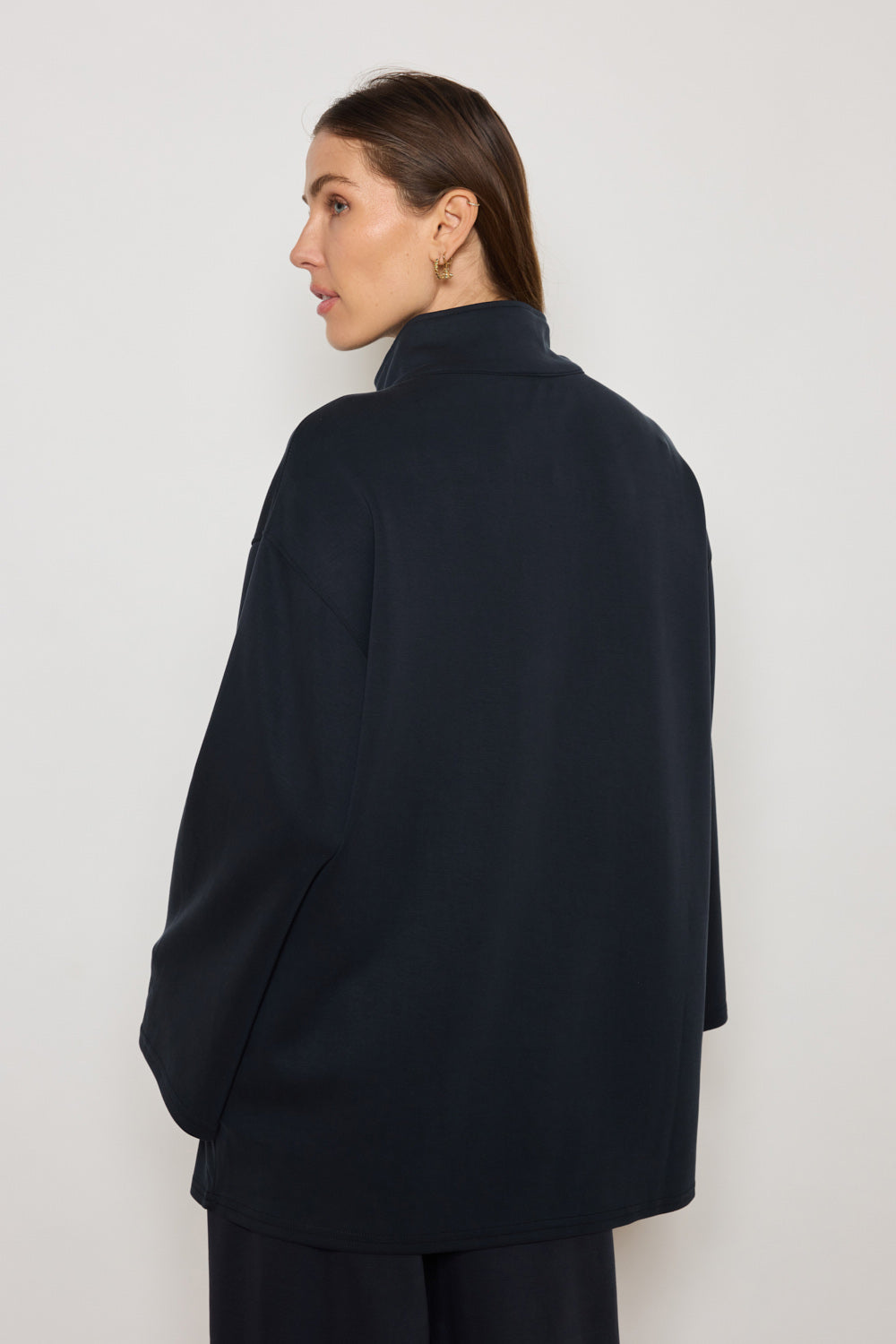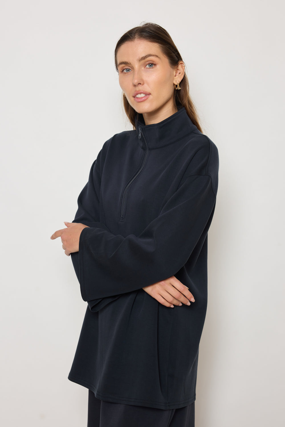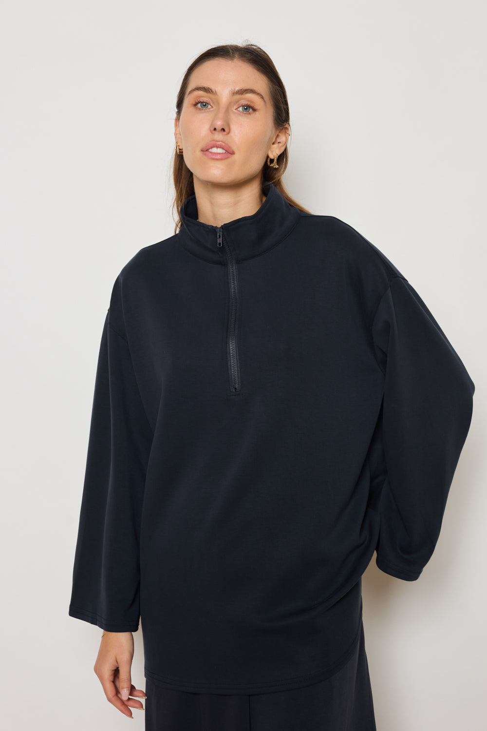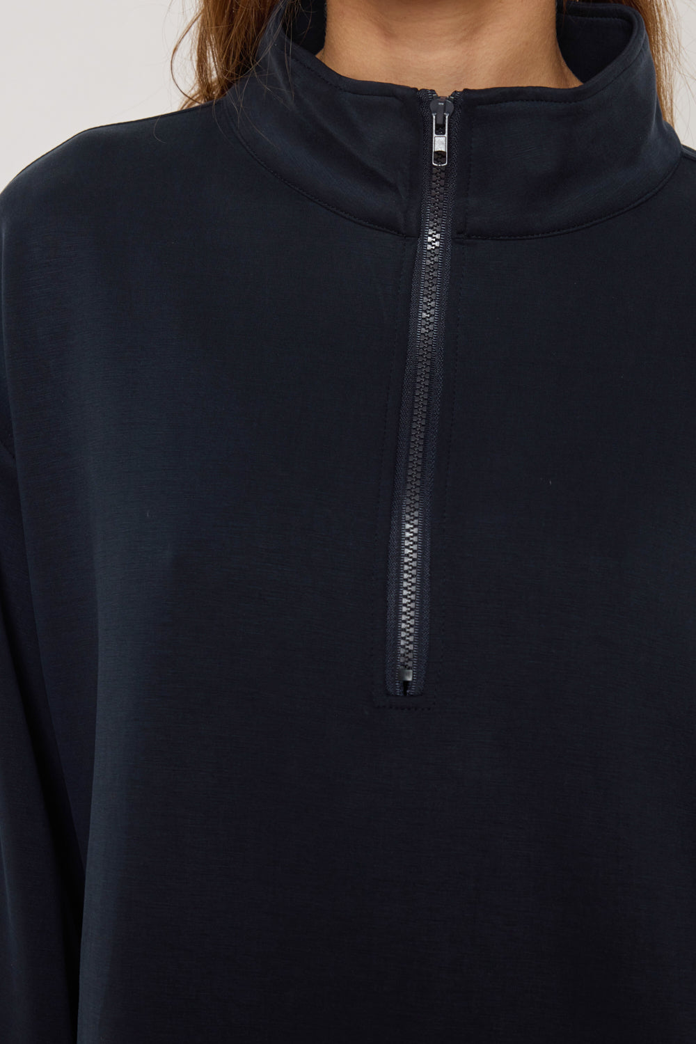 Sweat à manches longues avec fermeture zippée au col. Coupe droite et épaules tombantes pour une silhouette décontractée. Finitions droites au bas et poignets. Tissu fluide à toucher doux.
