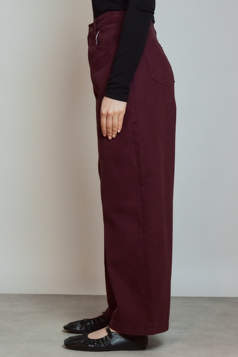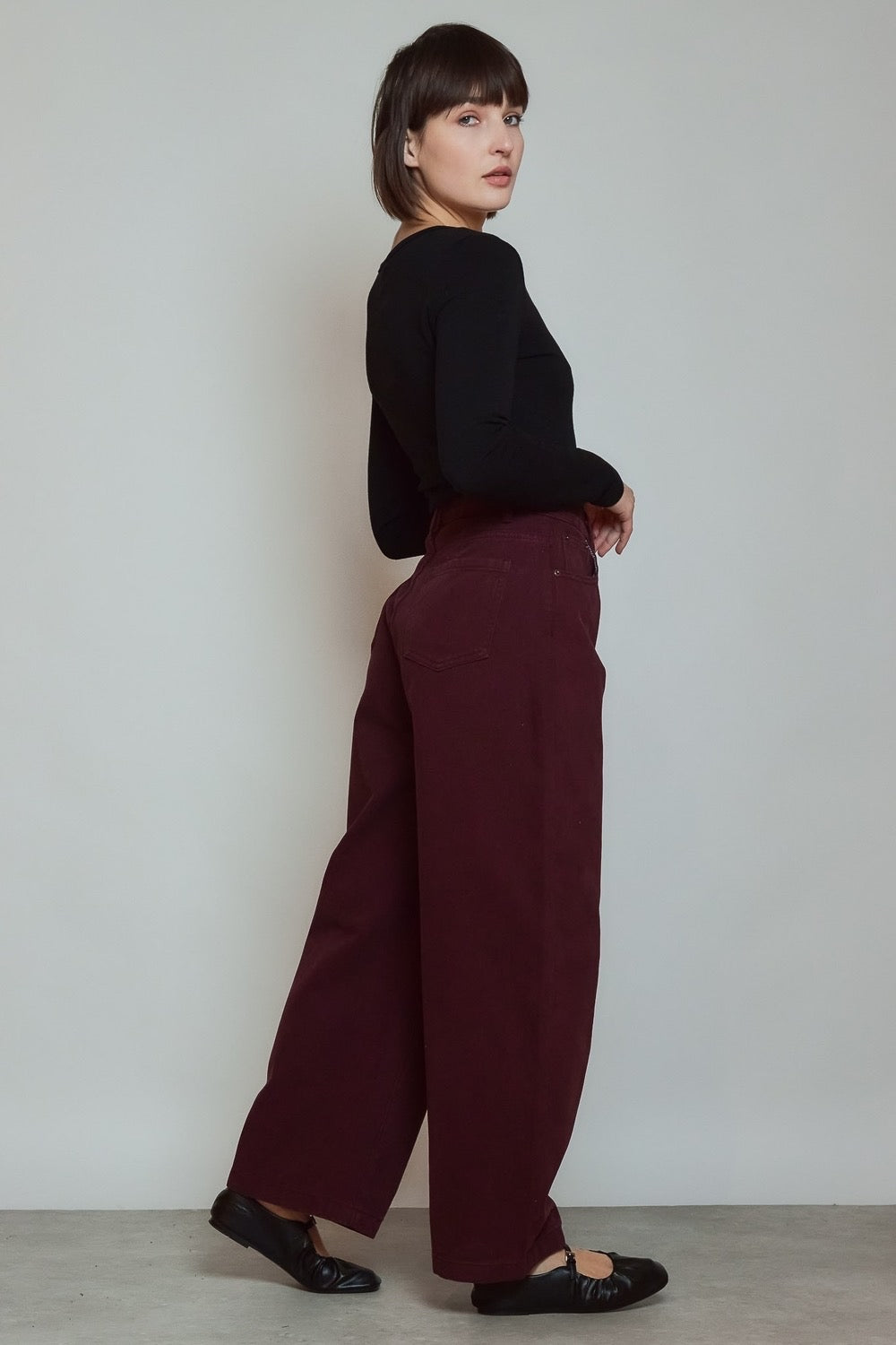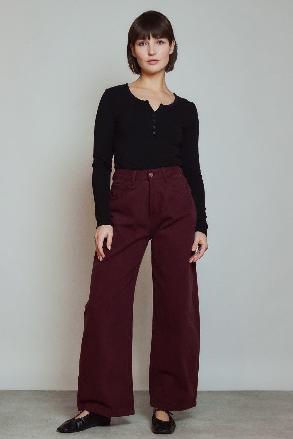 Jean à jambe large avec taille haute et passants pour ceinture. Fermeture par bouton et zip dissimulé. Poches cavalières à l’avant et poches plaquées à l’arrière. Longueur pleine et coupe structurée.