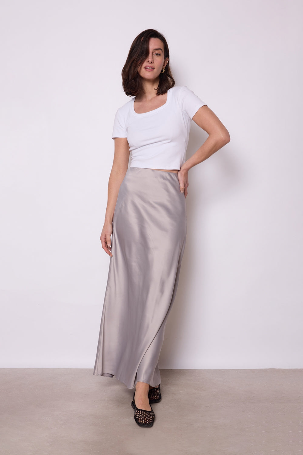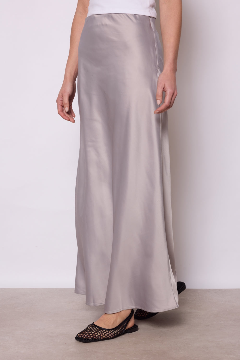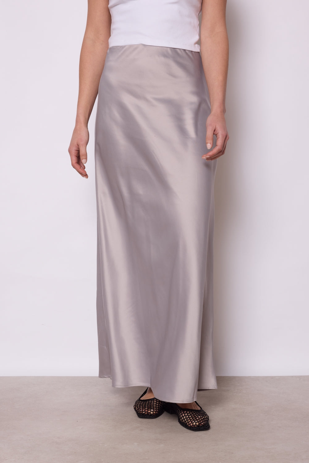 Jupe longue en satin avec une coupe fluide et élégante. Taille ajustée pour un maintien parfait et une silhouette flatteuse. Finition brillante pour une allure sophistiquée. Parfaite pour un look chic
