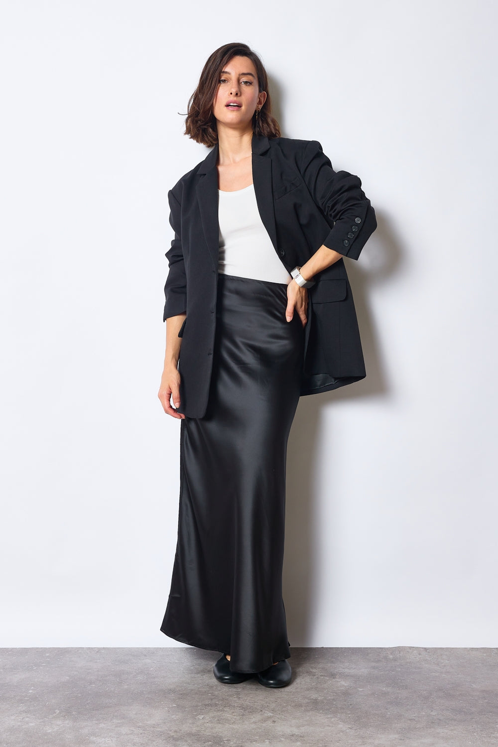 Jupe longue en satin avec une coupe fluide et élégante. Taille ajustée pour un maintien parfait et une silhouette flatteuse. Finition brillante pour une allure sophistiquée. Parfaite pour un look chic