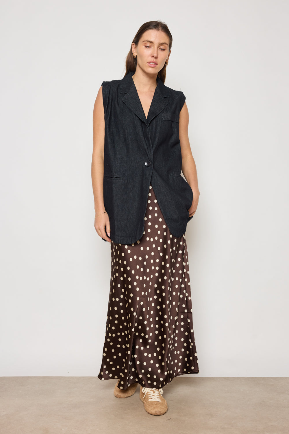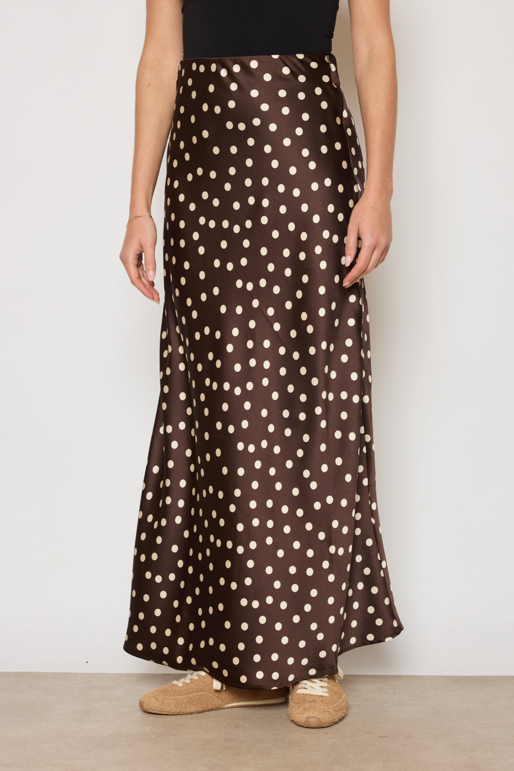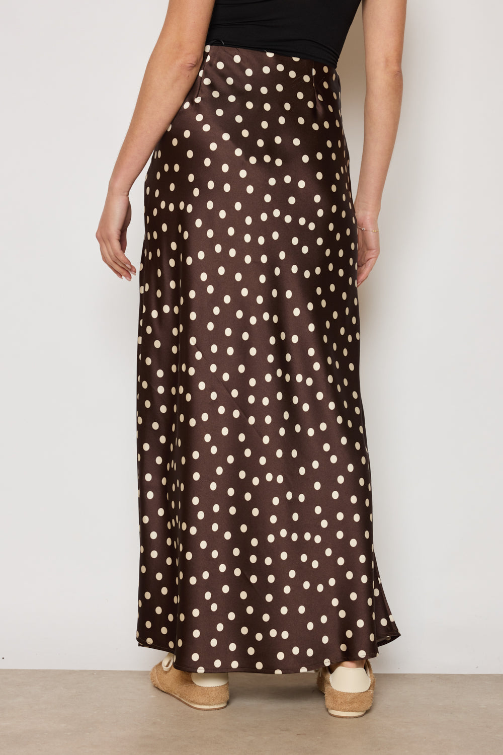 Jupe longueur cheville avec taille plate et fermeture invisible sur le côté. Tissu fluide à fini satiné, coupe légèrement évasée. Motif à pois répartis de manière régulière sur l’ensemble.