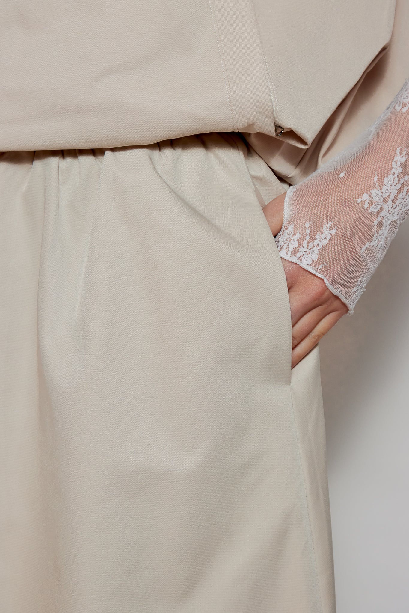 Jupe coupe droite et ample avec taille élastiquée ajustable par cordon. Longueur cheville, finition droite au bas. Tissu lisse au tombé fluide, sans détails superflus.