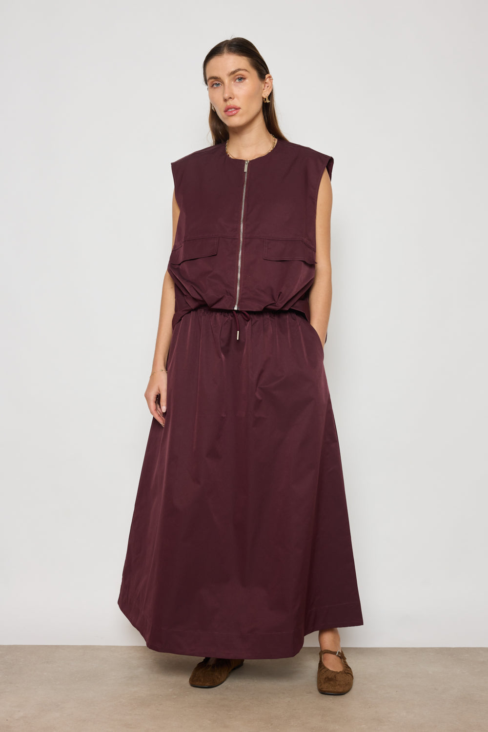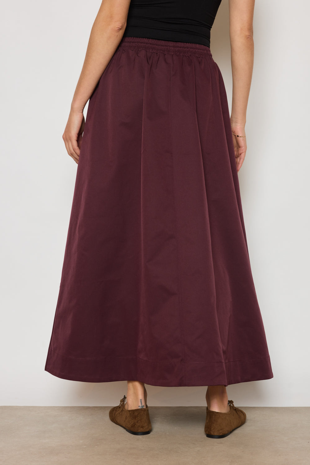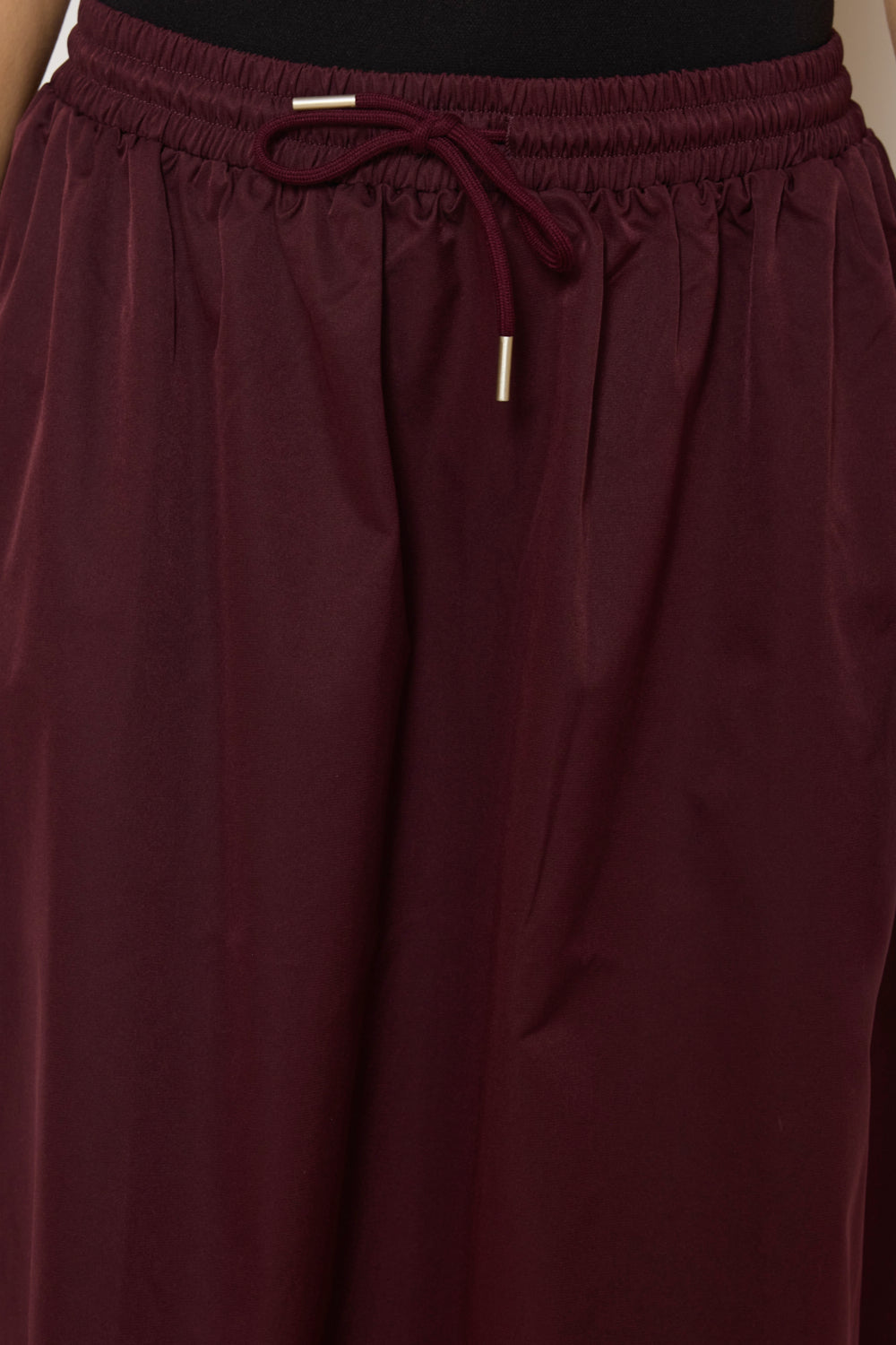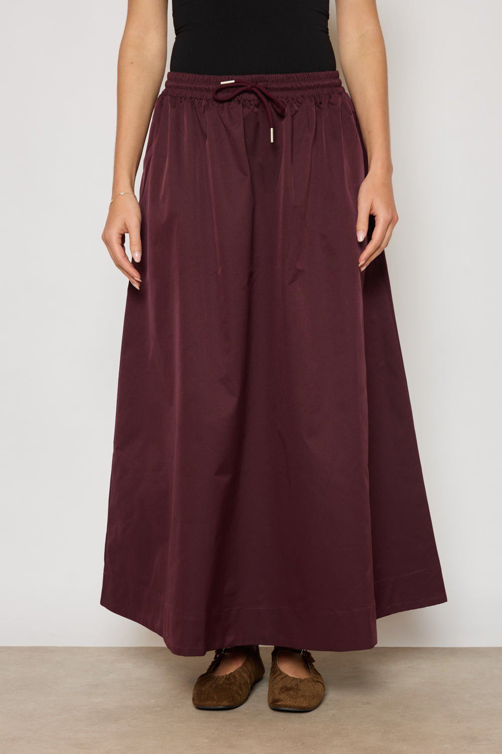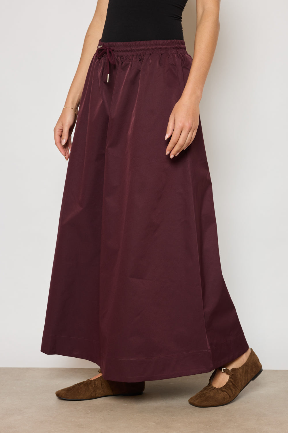 Jupe coupe droite et ample avec taille élastiquée ajustable par cordon. Longueur cheville, finition droite au bas. Tissu lisse au tombé fluide, sans détails superflus.