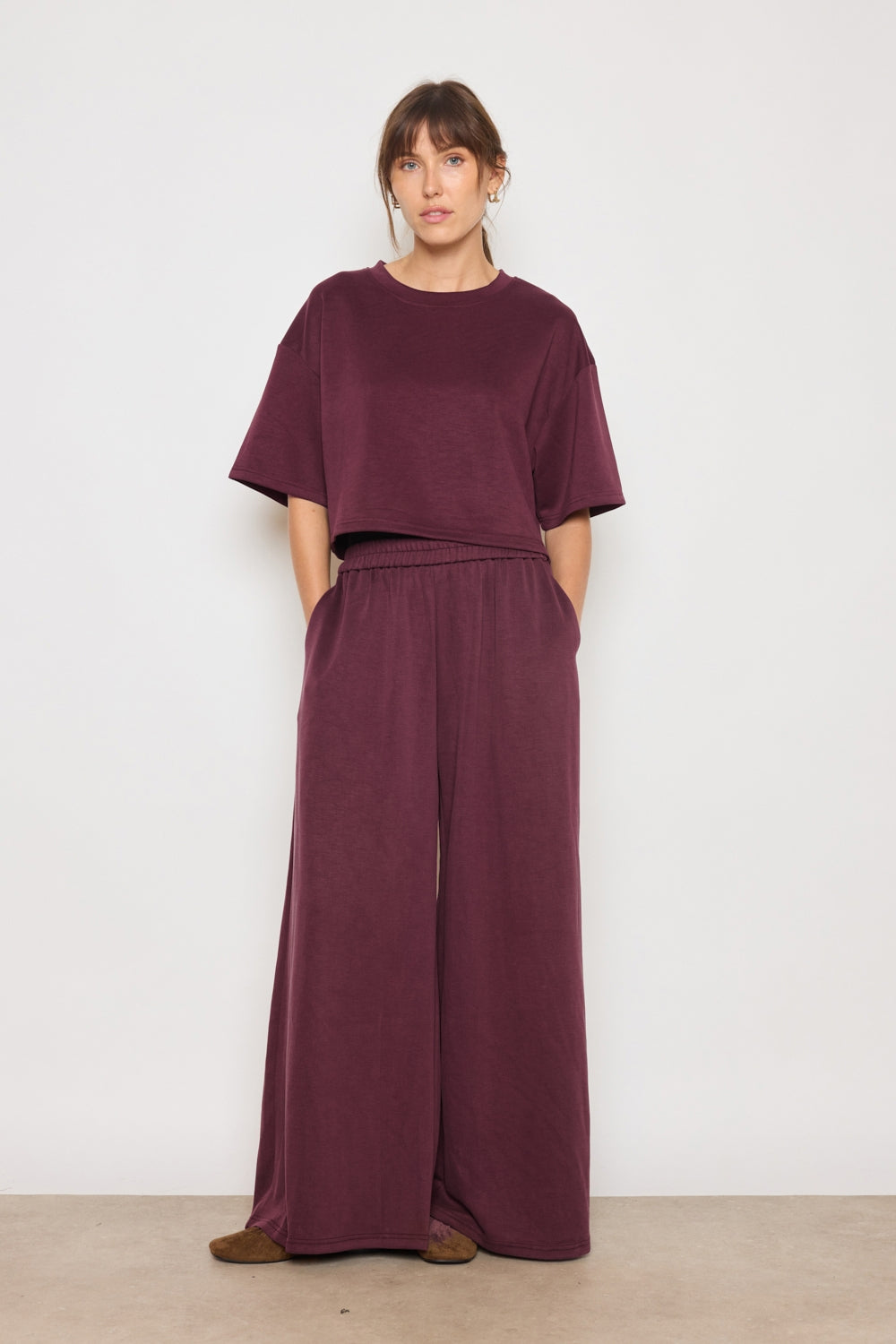 Pantalon à coupe large et jambe très évasée. Ceinture élastiquée pour un enfilage facile et un confort optimal. Tissu léger avec tombé souple. Finition sans poches pour une silhouette épurée.