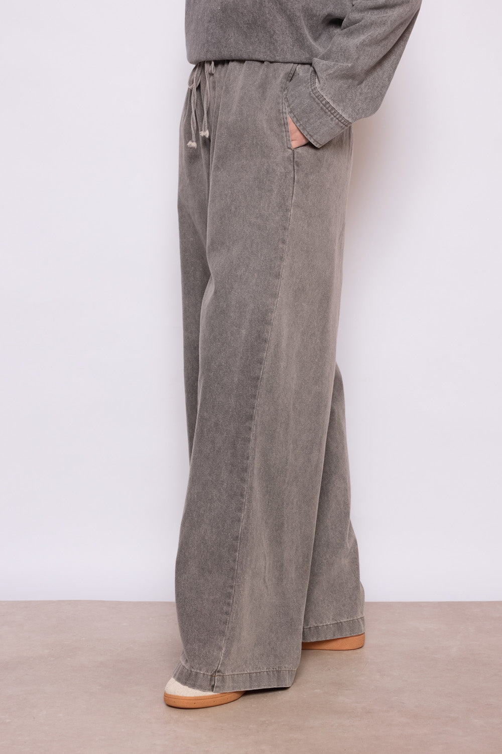Pantalon coupe droite avec taille haute et cordon de serrage. Finition délavée avec coutures visibles contrastées. Deux poches latérales intégrées. Bas légèrement évasé pour un tombé fluide.