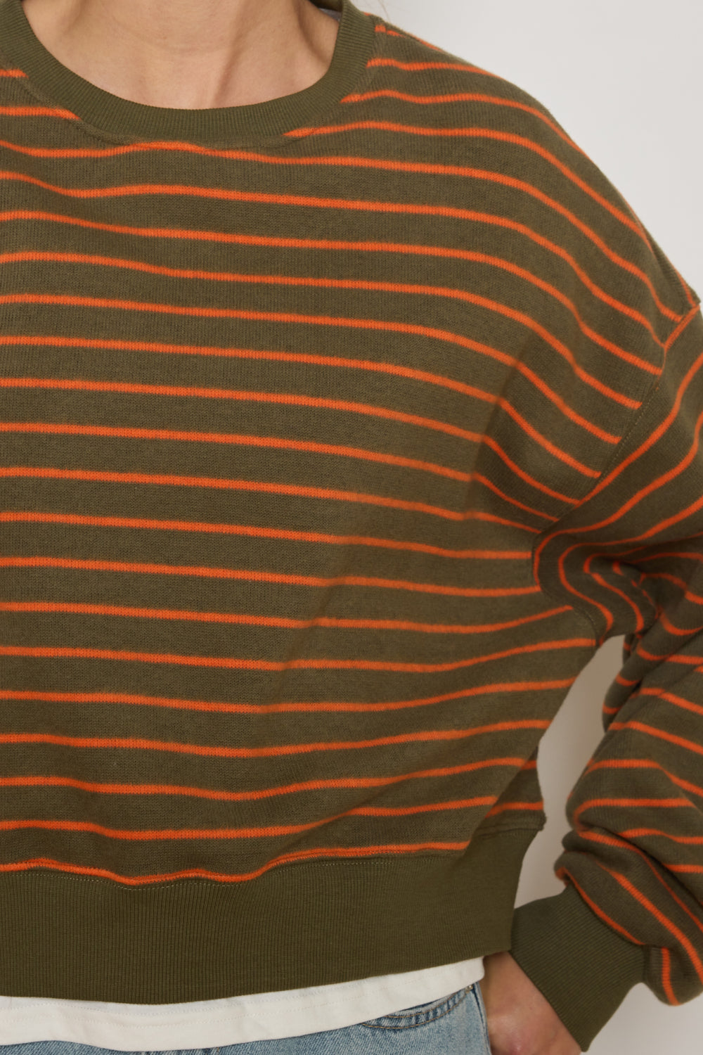 Sweat coupe droite avec encolure ronde et finitions côtelées. Motif à rayures horizontales sur l’ensemble. Épaules tombantes pour un effet décontracté. Base légèrement ajustée par bord-côte.
