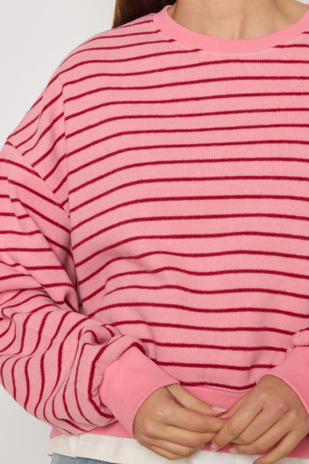 Sweat coupe droite avec encolure ronde et finitions côtelées. Motif à rayures horizontales sur l’ensemble. Épaules tombantes pour un effet décontracté. Base légèrement ajustée par bord-côte.
