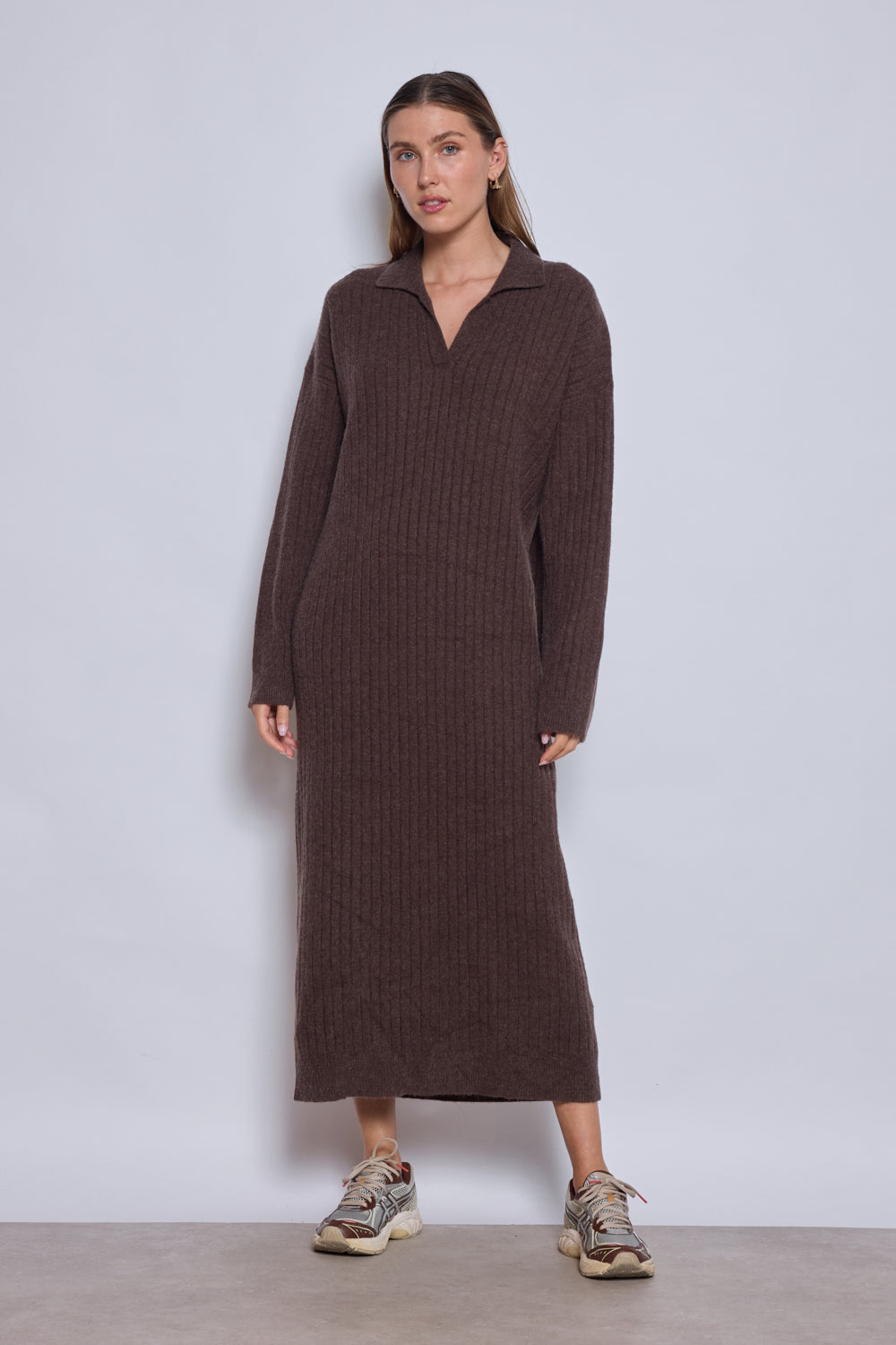 Robe à col polo avec encolure en V ouverte et manches longues. Coupe droite légèrement ajustée. Maille côtelée verticale sur l’ensemble de la pièce. Longueur mi-mollet avec finition droite.