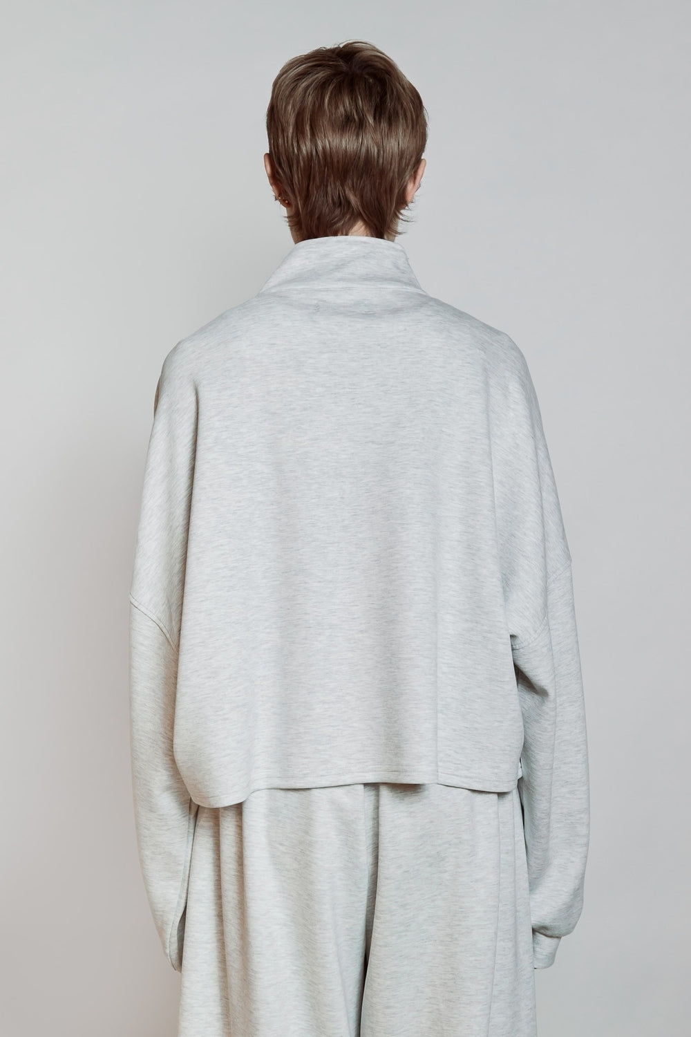 Sweat à col montant avec ouverture zippée centrée sur le devant. Coupe ample structurée par des épaules tombantes et des manches longues volumineuses. Bas du vêtement droit contrastant avec des poignets resserrés créant un jeu de proportions.