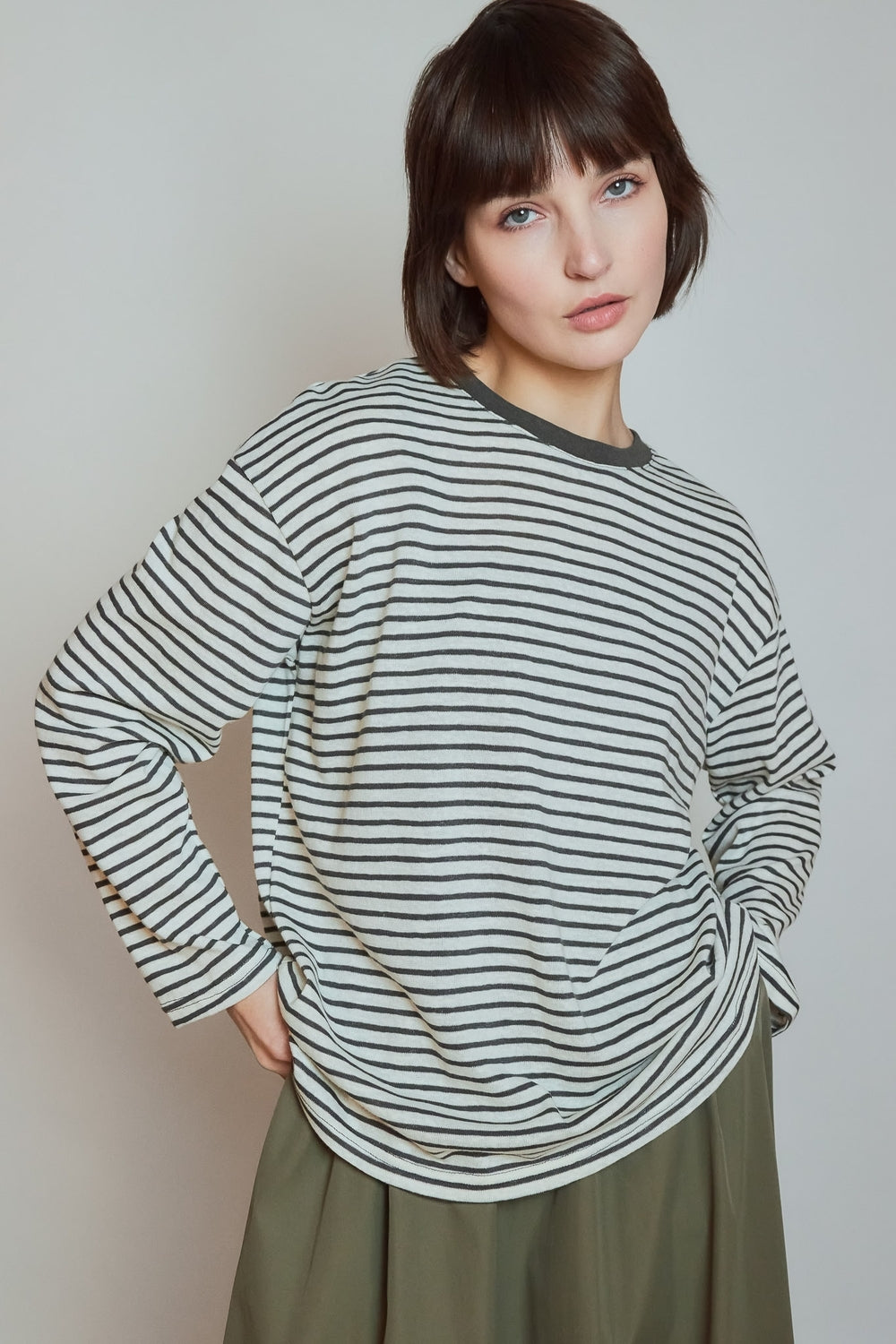 T-shirt à encolure ronde avec coupe ample et ligne droite. Manches longues à épaules tombantes accentuant le volume naturel du vêtement. Motif rayé fin et régulier structurant la surface sans ajout de détail.