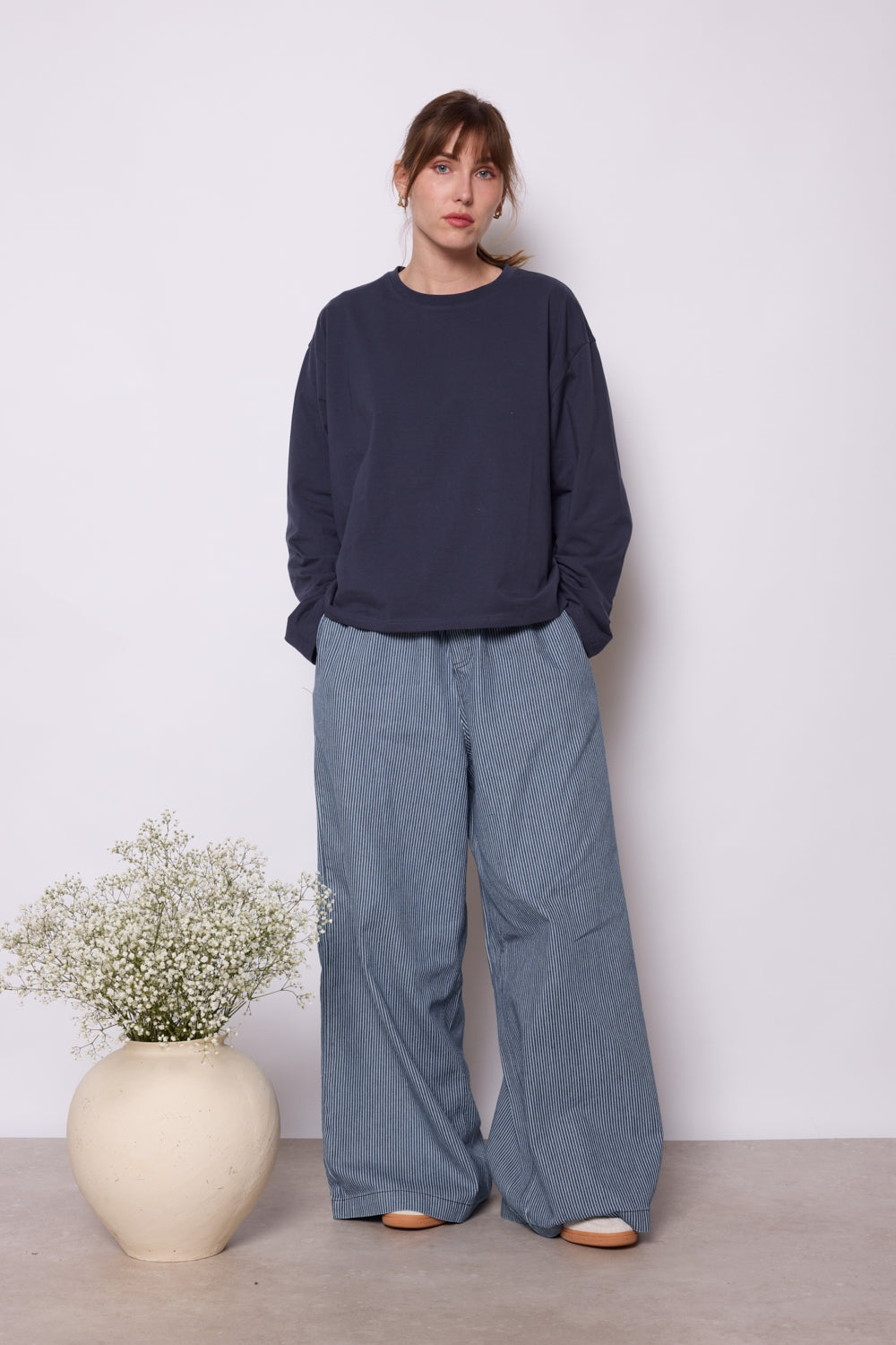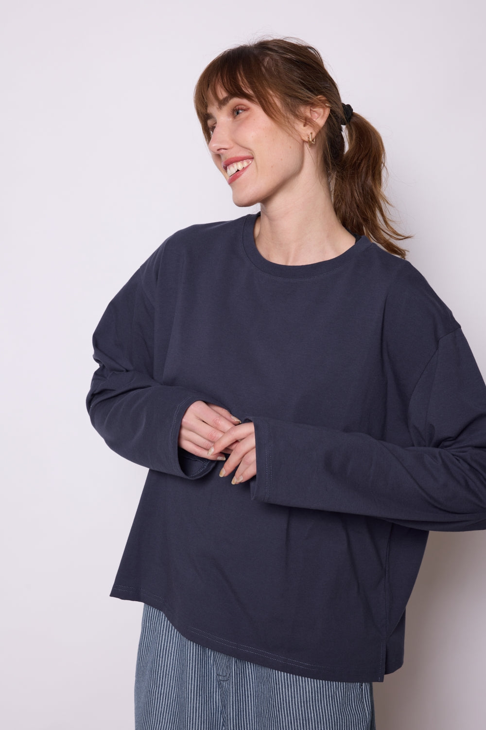 T-shirt à manches longues avec une coupe ample et un col rond classique. Design minimaliste pour un look épuré et polyvalent. Parfait pour des tenues décontractées ou comme pièce de superposition.