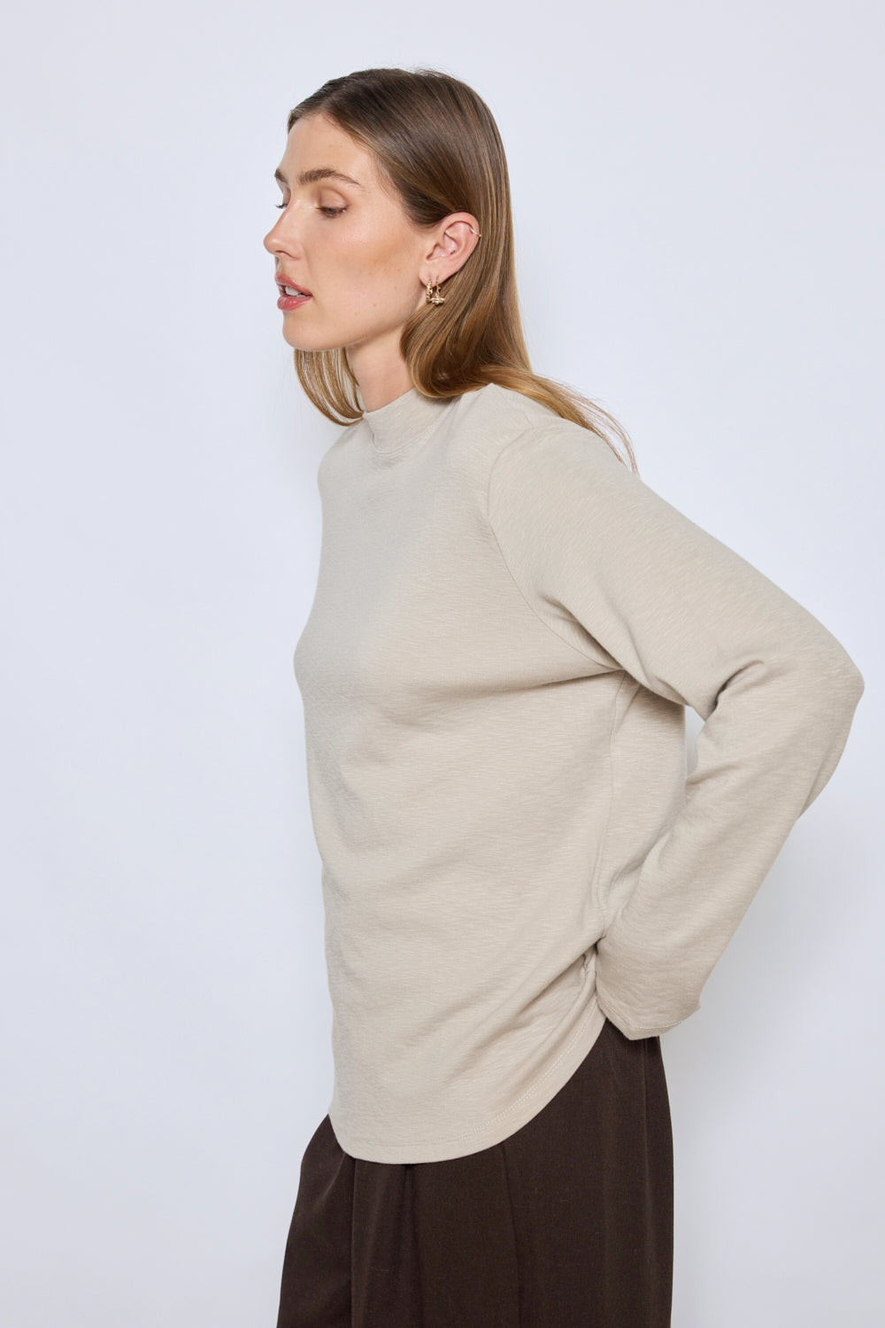 T-shirt à coupe droite avec col rond et manches longues. Matière légère et texture lisse pour un confort optimal. Finitions discrètes aux poignets et à l’ourlet pour un style épuré.
