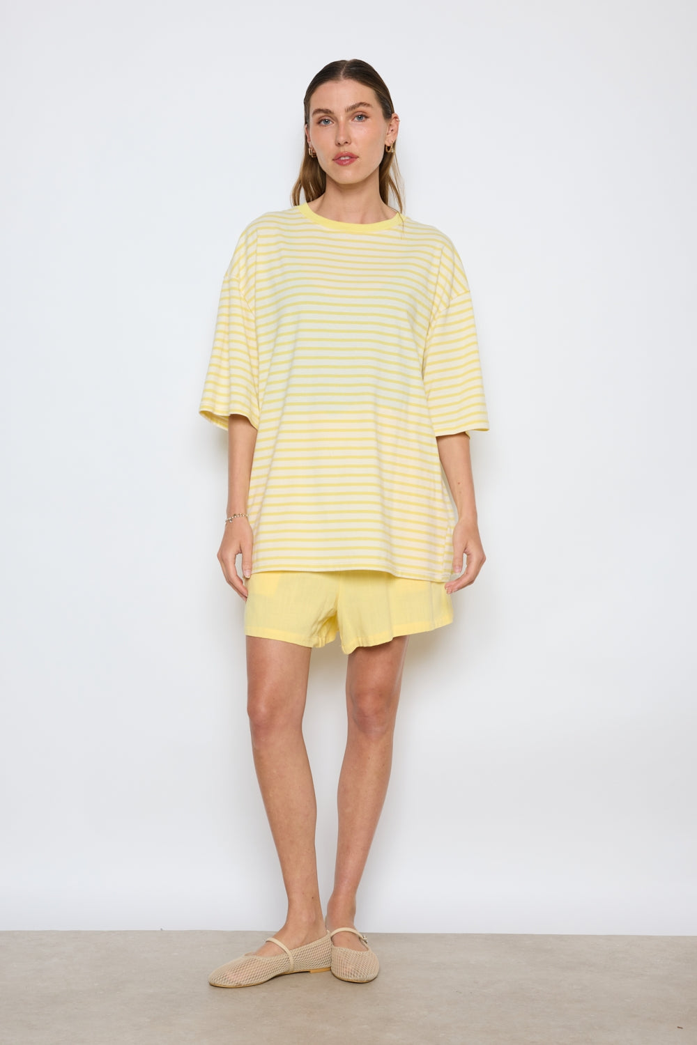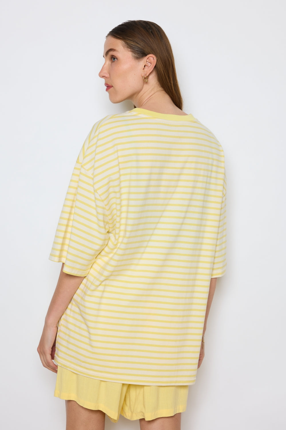 T-shirt à coupe ample avec manches courtes allongées. Encolure ronde contrastée. Rayures régulières sur l’ensemble du tissu. Épaules tombantes pour une silhouette décontractée.