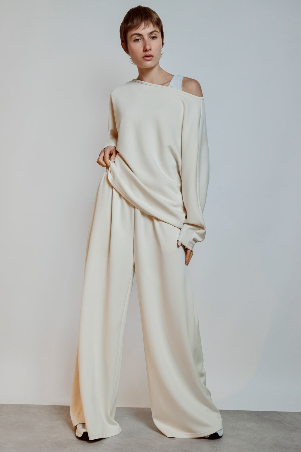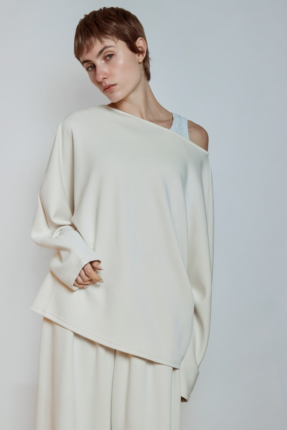 T-shirt à manches longues avec encolure bateau dégagée. Coupe droite offrant un tombé fluide et une ligne continue sur le buste. Épaules légèrement tombantes accentuant le volume naturel du vêtement.