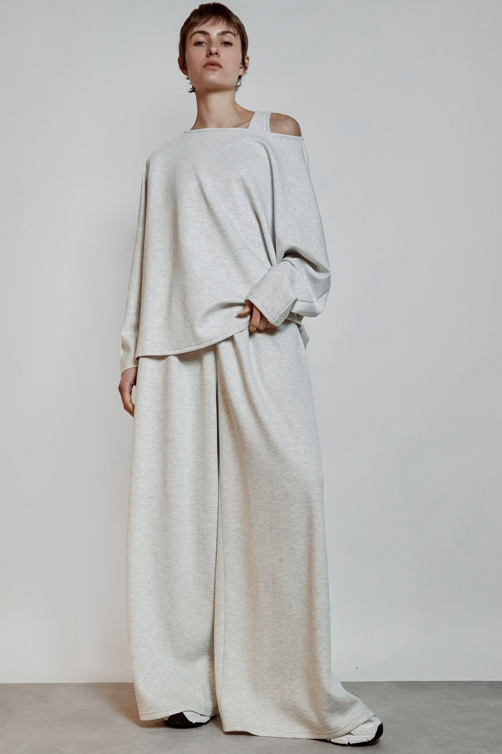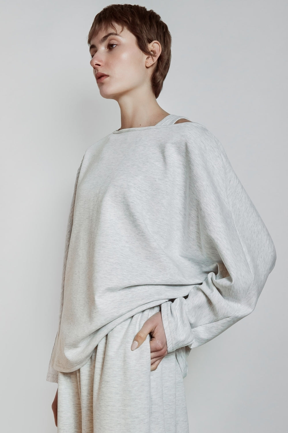 T-shirt à manches longues avec encolure bateau dégagée. Coupe droite offrant un tombé fluide et une ligne continue sur le buste. Épaules légèrement tombantes accentuant le volume naturel du vêtement.
