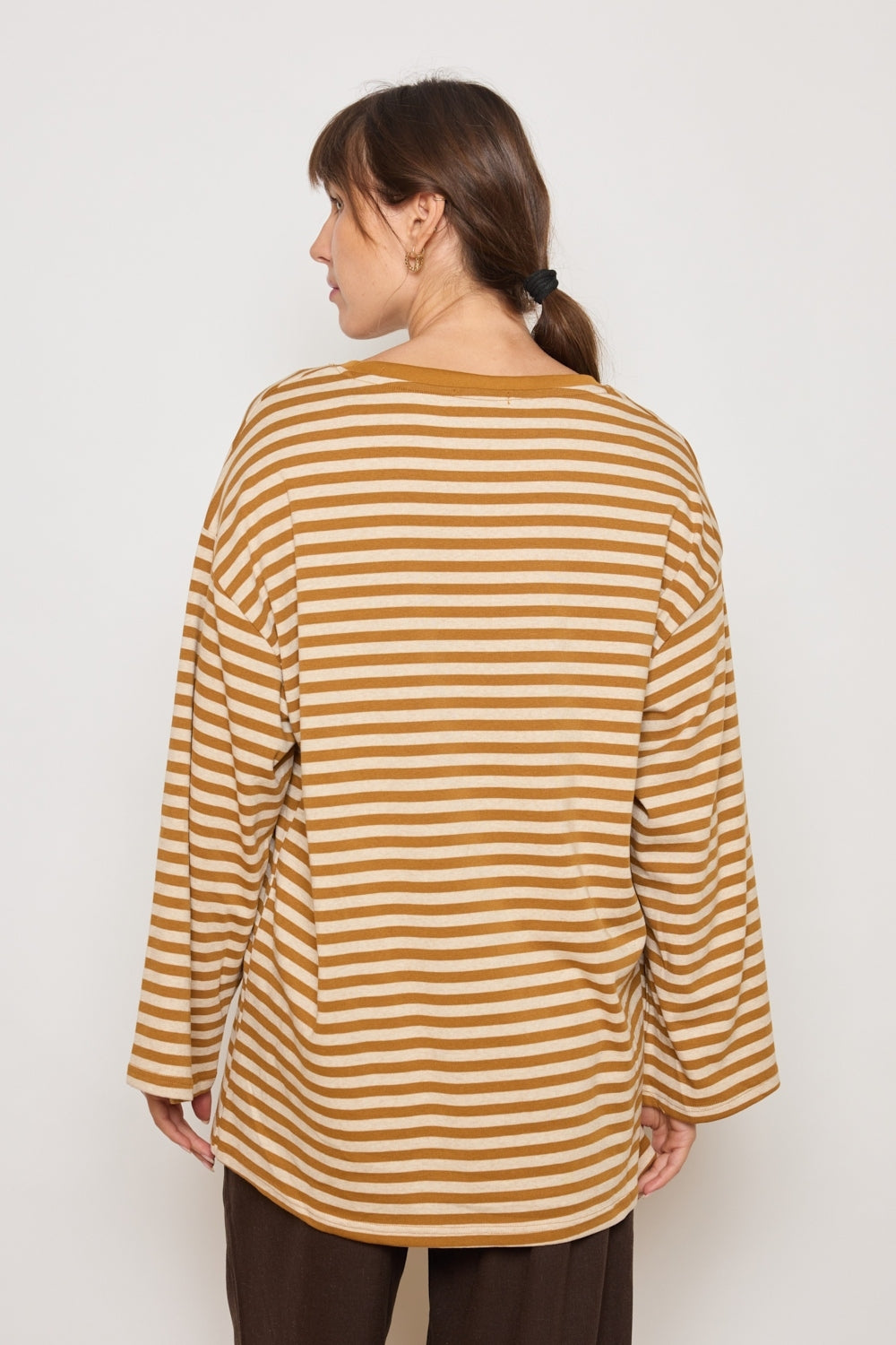 T-shirt en jersey à coupe large et épaules tombantes. Encolure ronde avec finitions côtelées. Fentes discrètes sur les côtés de l’ourlet. Motif à rayures horizontales sur l’ensemble.