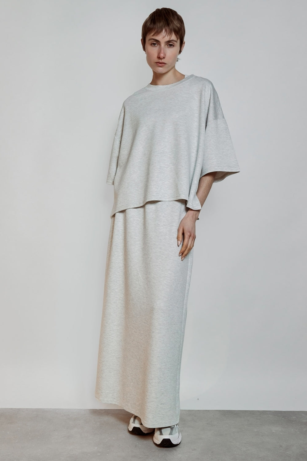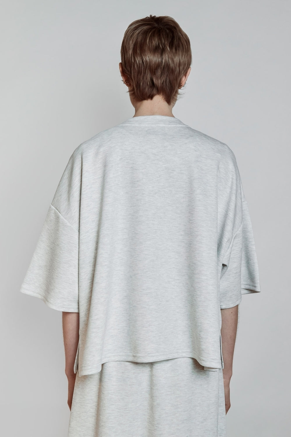 T-shirt à encolure ronde avec coupe ample et ligne droite. Manches courtes larges et épaules tombantes créant un volume fluide. Tombé souple structuré par une construction simple et continue.