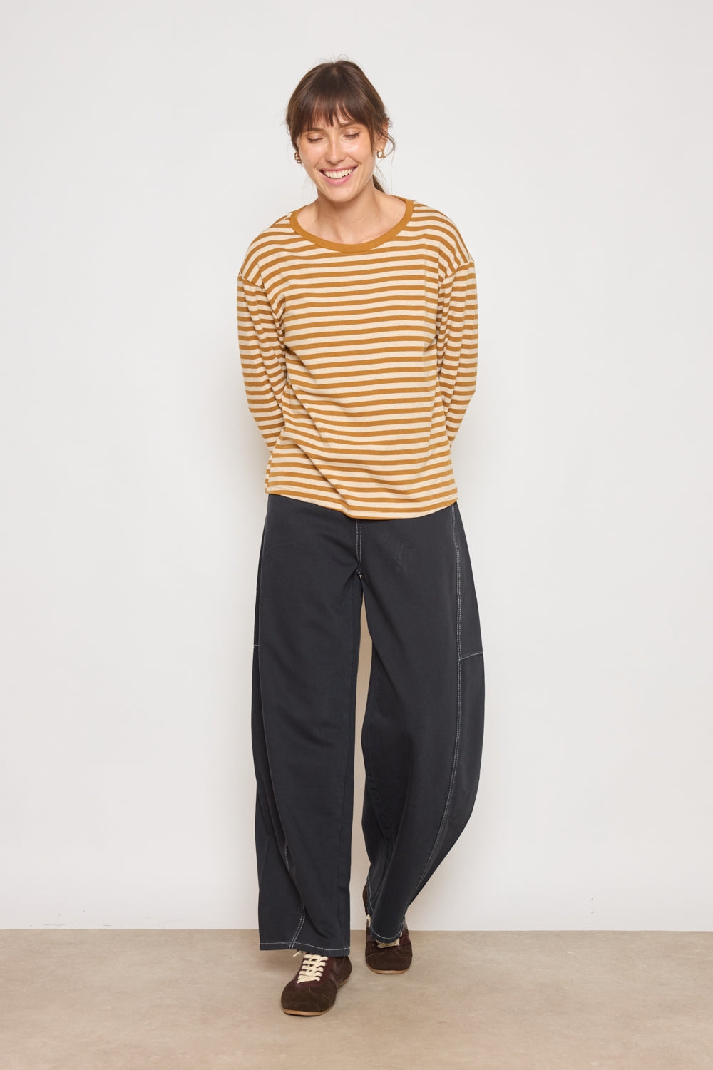 T-shirt à encolure ronde avec coupe ample et ligne droite. Manches longues à épaules légèrement tombantes apportant un volume souple. Motif rayé régulier structurant visuellement l’ensemble du vêtement.