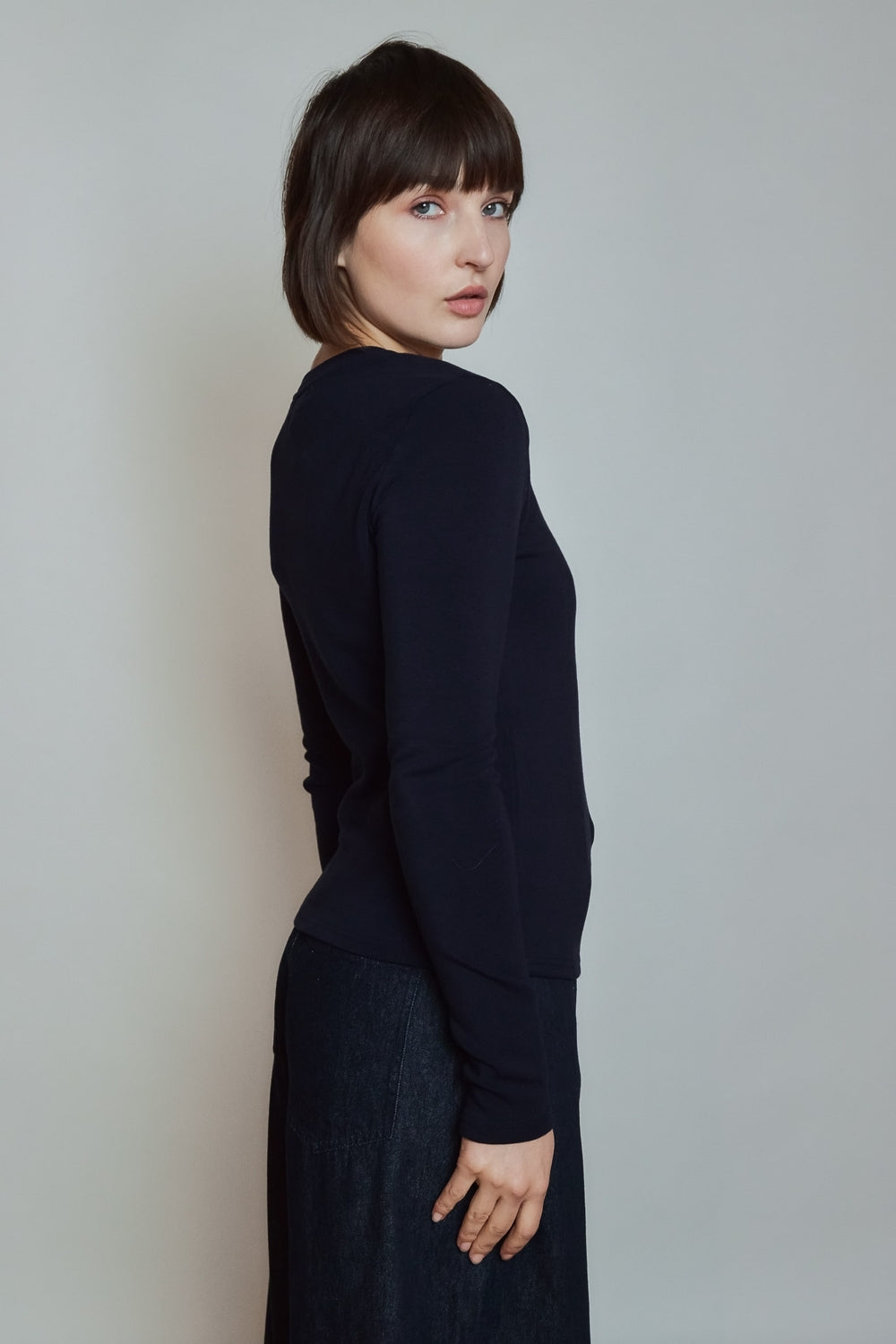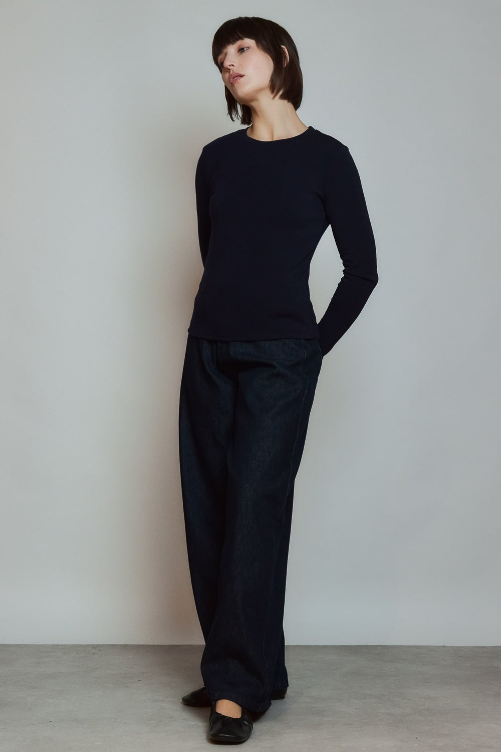 Top à manches longues à la ligne nette, réalisé dans une matière fine et confortable. L’encolure ras-du-cou et la coupe ajustée dessinent une silhouette épurée. Une pièce essentielle, pensée pour un vestiaire minimal et contemporain.