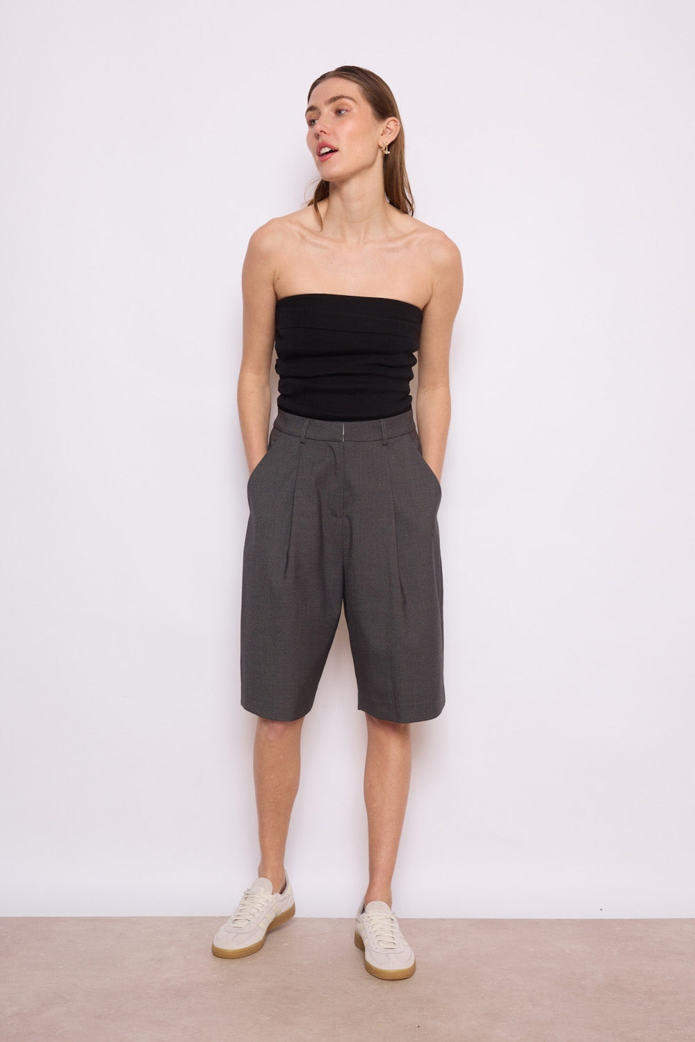 Top bustier sans manches avec une coupe ajustée et une structure drapée asymétrique sur le devant. Parfait pour une tenue élégante et sophistiquée.