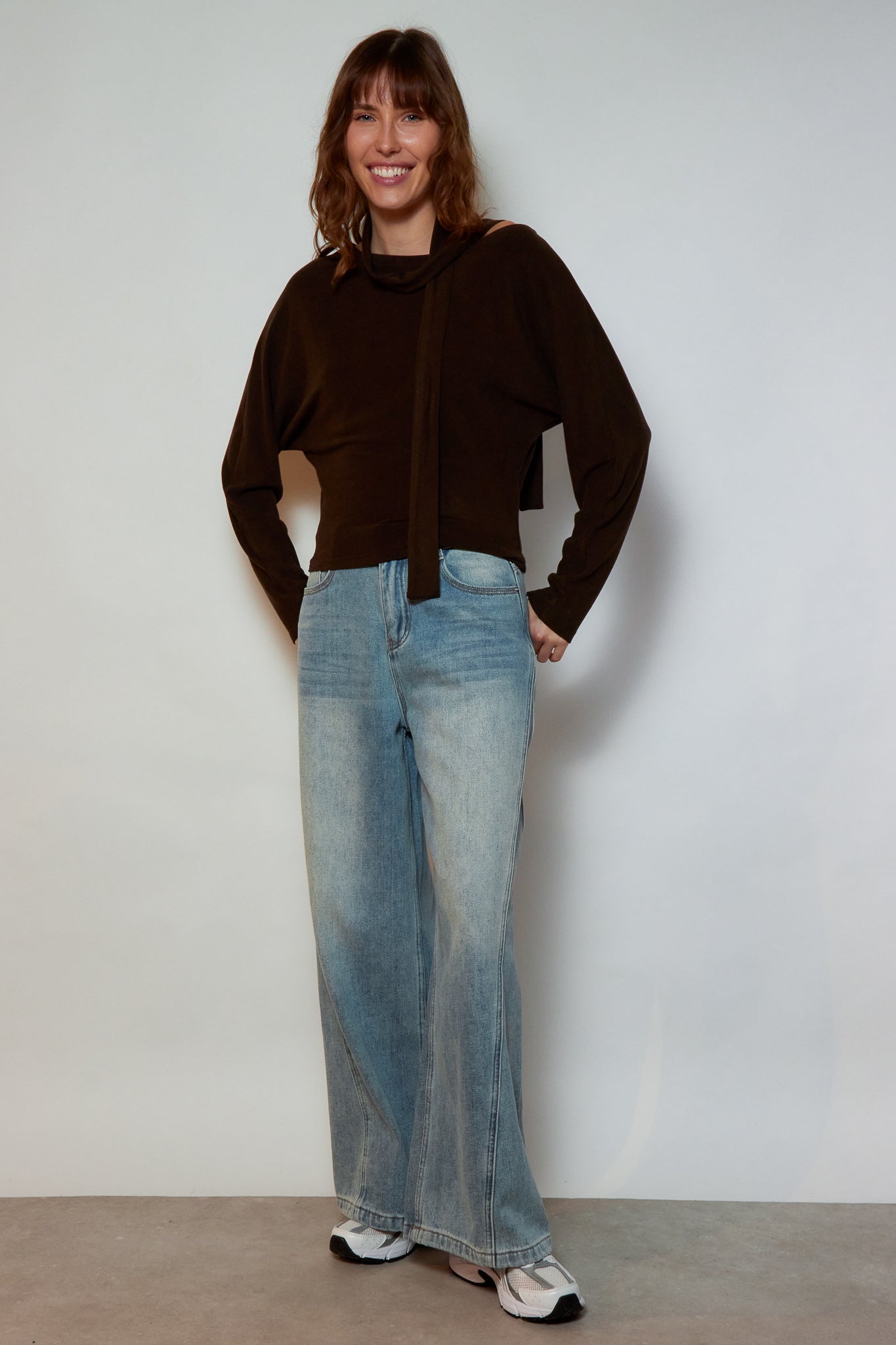 Top fluide à manches longues, dessiné dans une matière douce au tombé souple. L’encolure dégagée se prolonge par un détail drapé qui structure la ligne. Une pièce contemporaine, pensée pour un porté simple et maîtrisé.