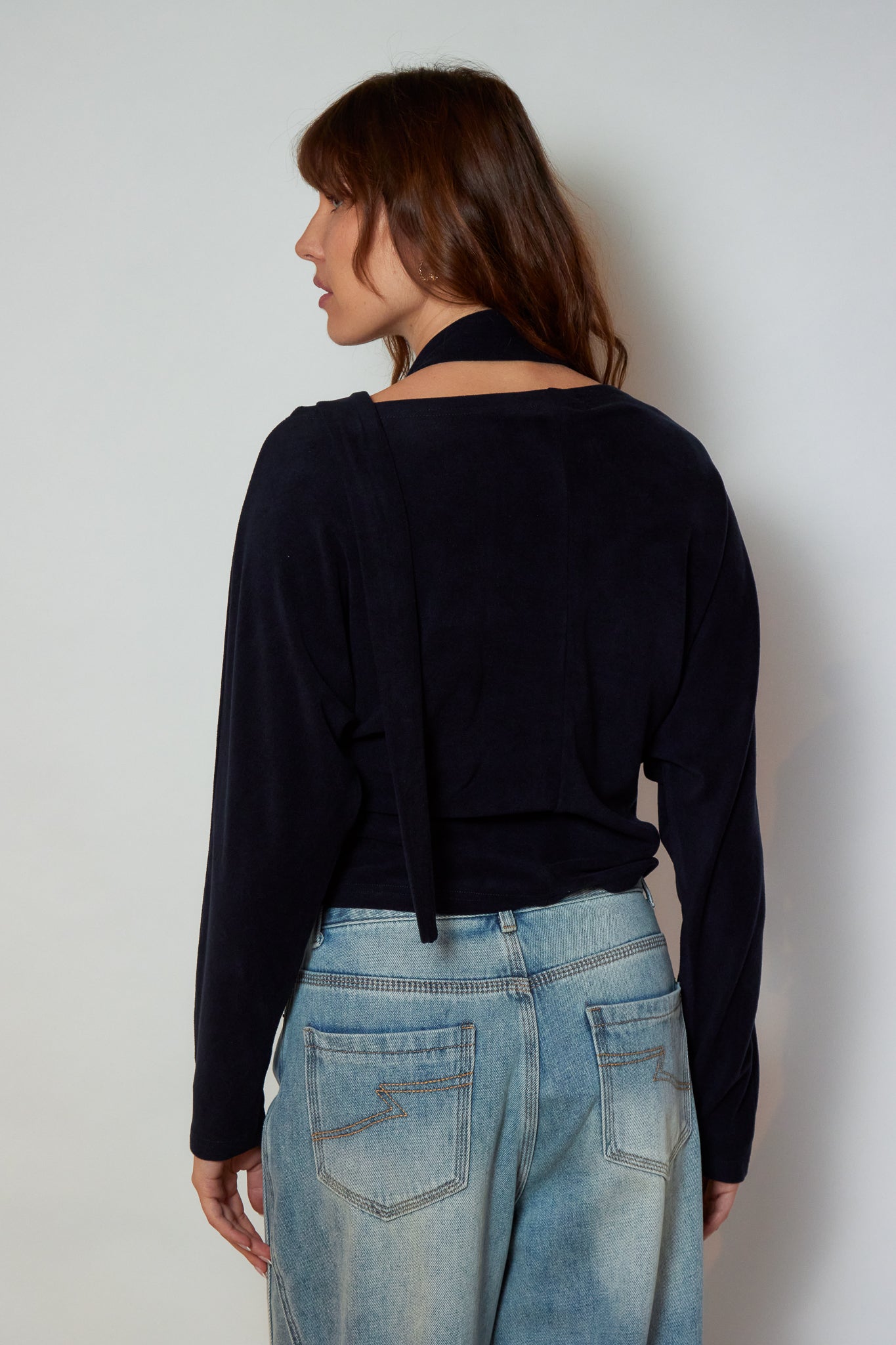 Top fluide à manches longues, dessiné dans une matière douce au tombé souple. L’encolure dégagée se prolonge par un détail drapé qui structure la ligne. Une pièce contemporaine, pensée pour un porté simple et maîtrisé.