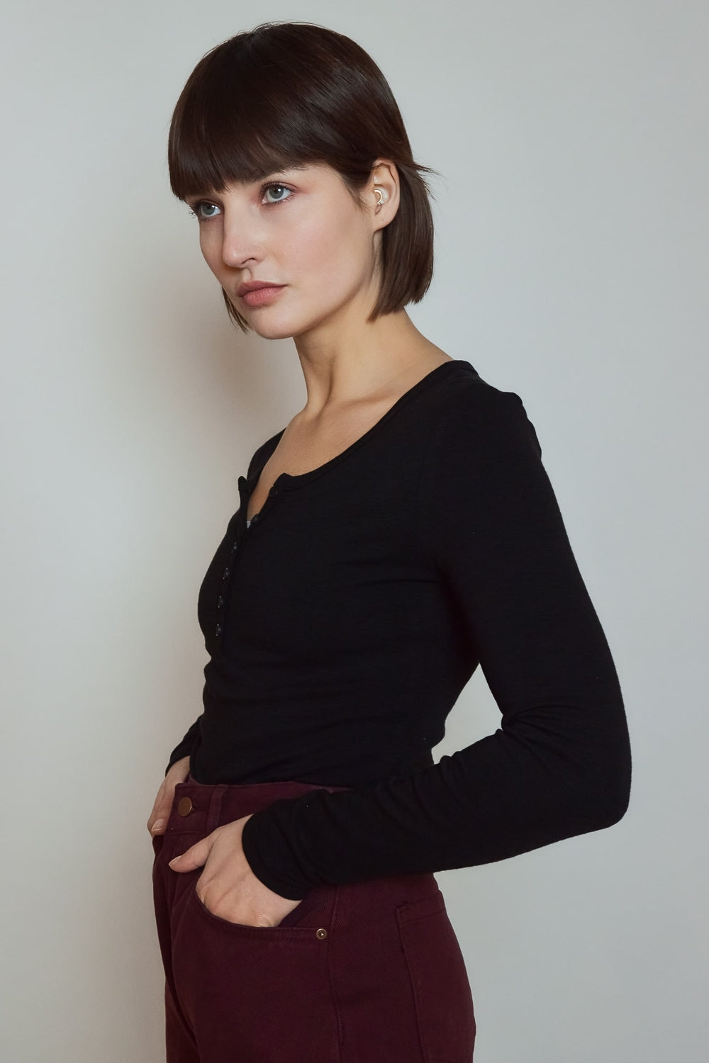Top à manches longues au tombé naturel, pensé pour un porté près du corps sans contrainte. L’encolure boutonnée apporte une touche discrète et fonctionnelle. Une pièce essentielle, facile à associer, qui traverse les saisons avec sobriété.